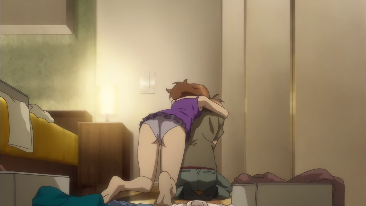 集に抱きつき乳房を押し当てる、キャミソールにパンツ姿の春夏。