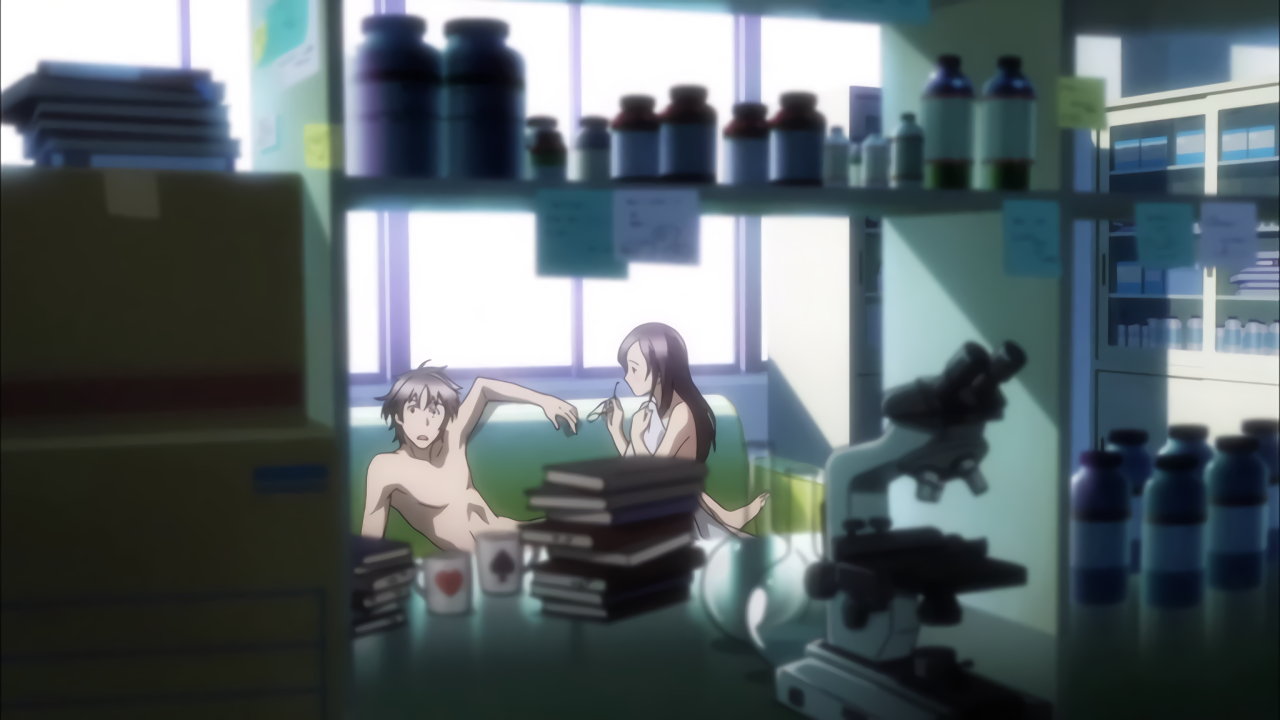 研究室にて性交中の、全裸の玄周と冴子を目撃する修一郎。