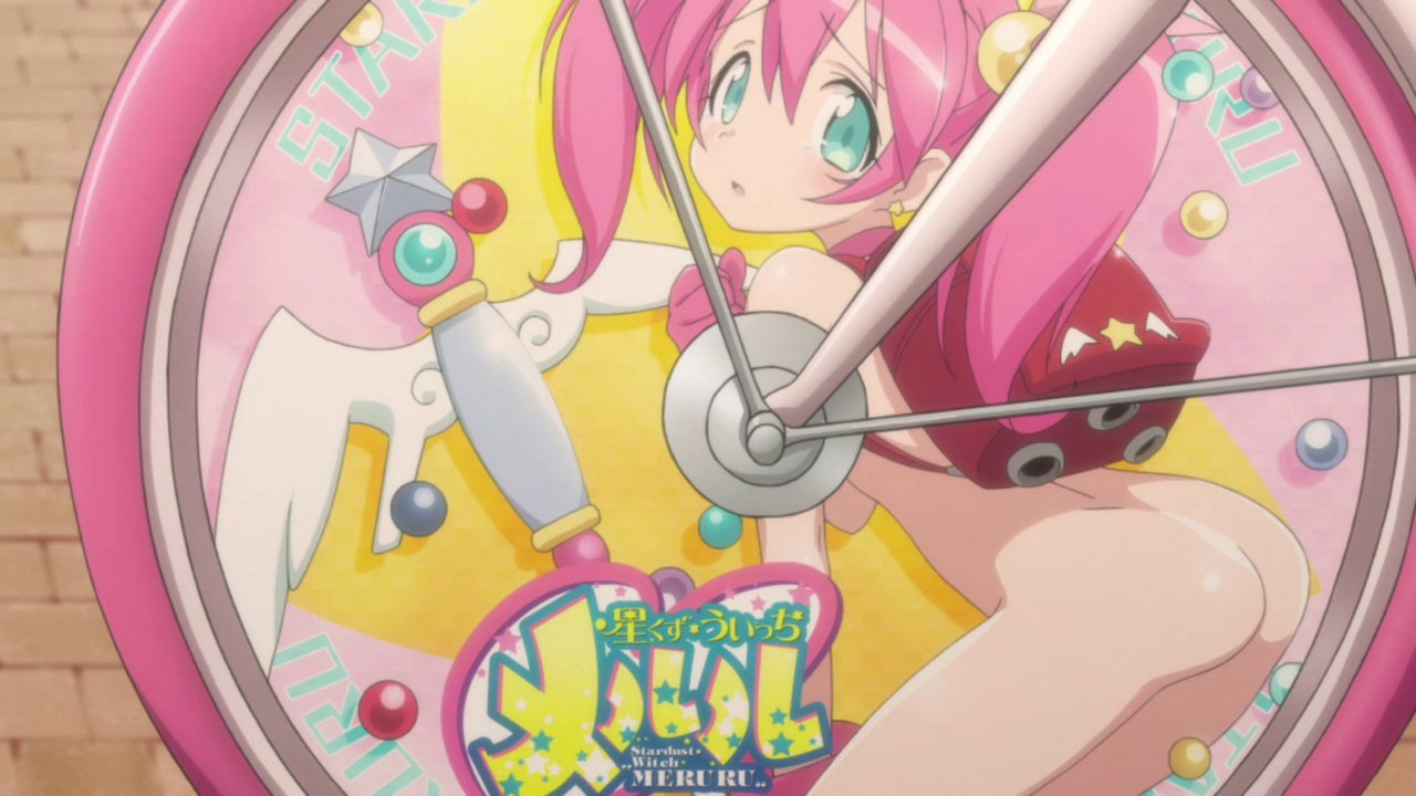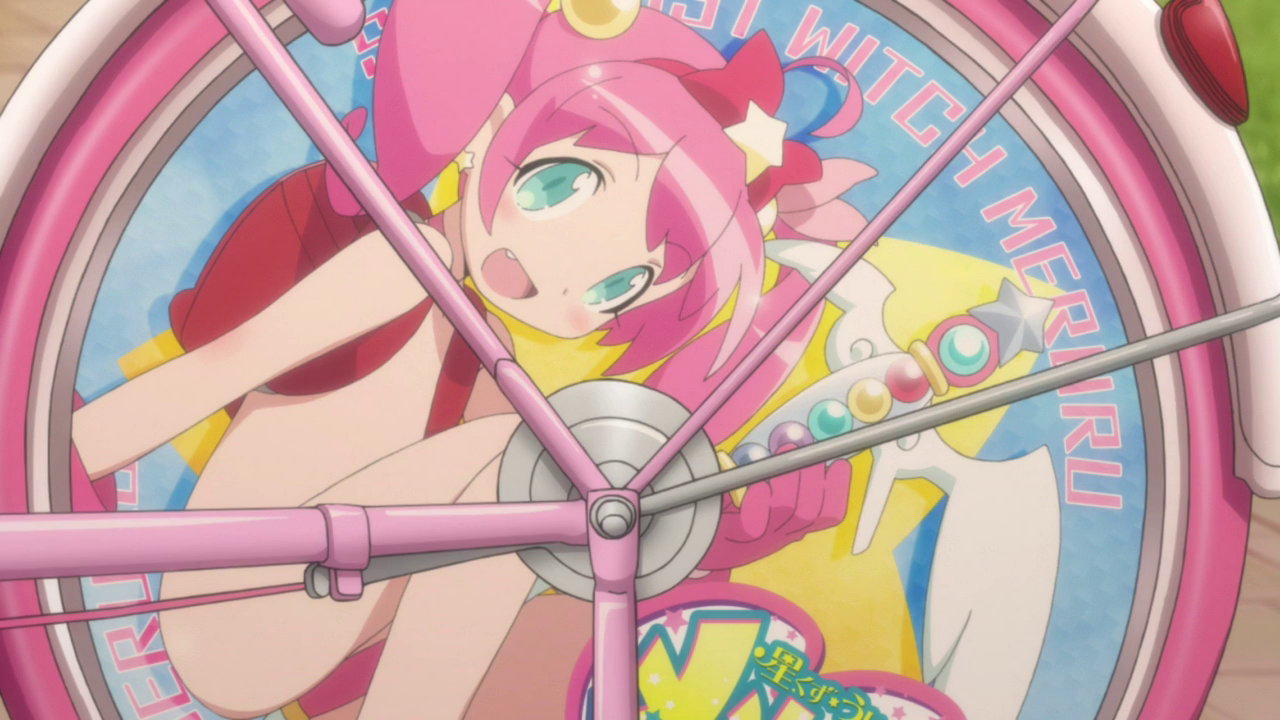 裸ランドセルの「星くずうぃっちメルル」が車輪に描かれた痛自転車。