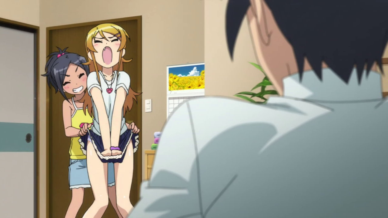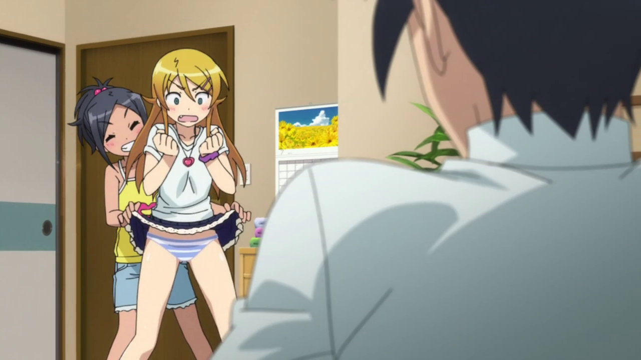 リアにスカートを捲られ、パンツ丸見えの桐乃。