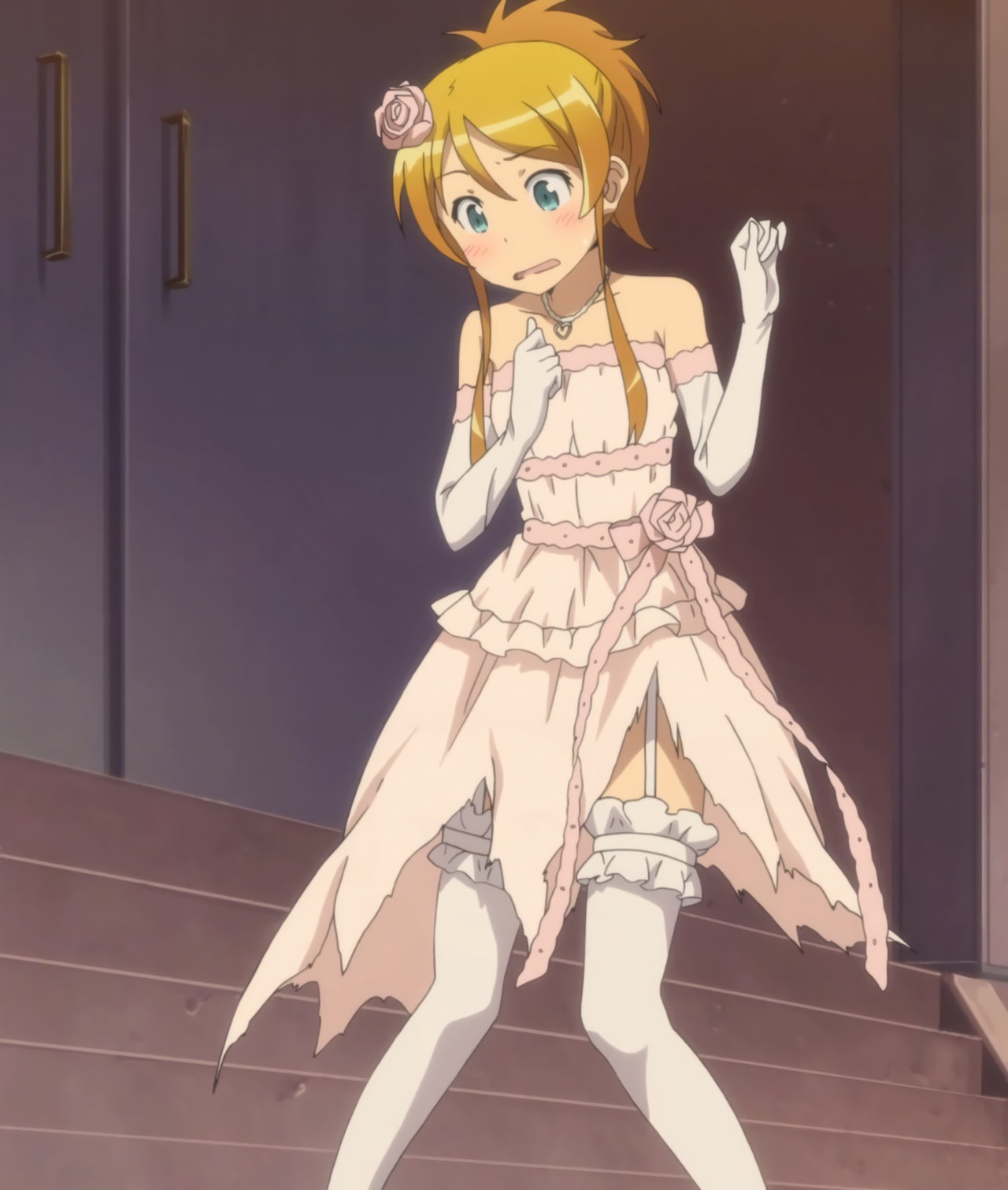 ウェディングドレスのスカートを破かれる桐乃。
