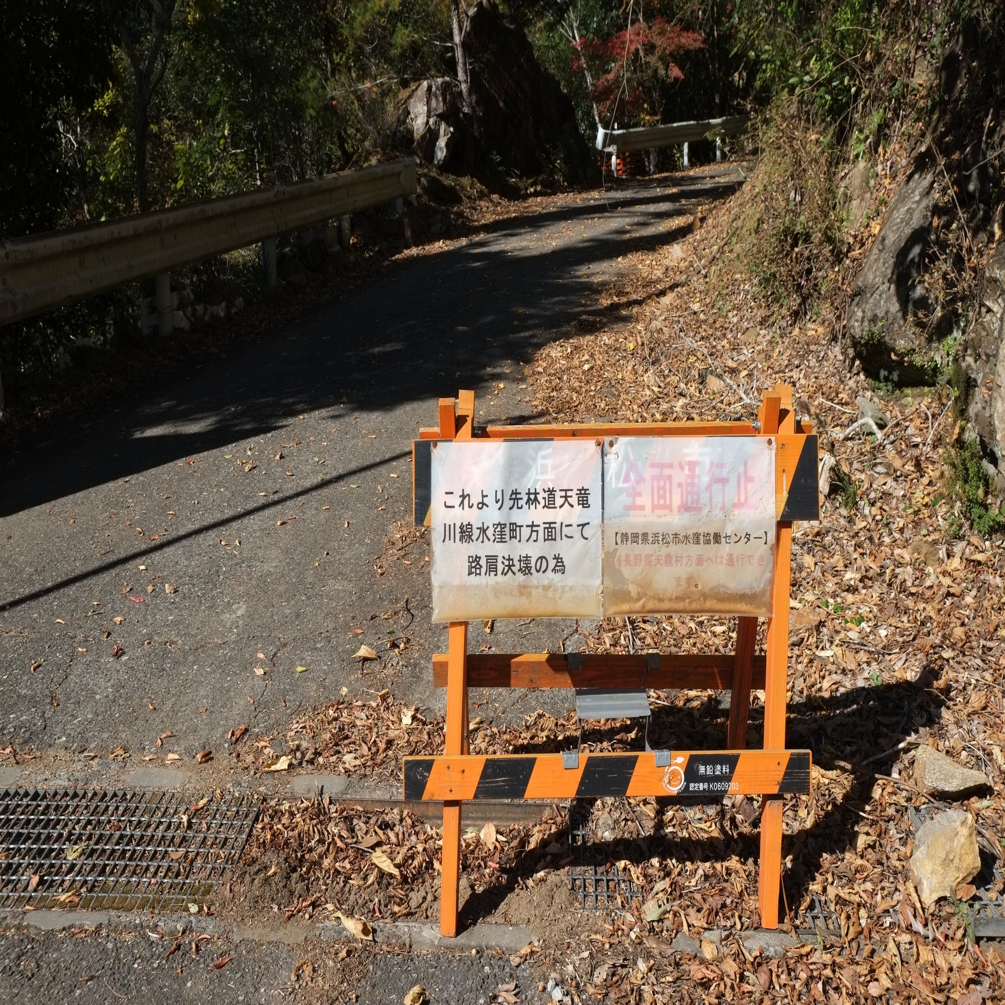 そこで、大嵐駅から天竜川沿いを一旦離れ、内陸部の水窪駅へ迂回する林道を地元の方に教えてもらい、望みをかけますが、ここも通行止めで万事休す。