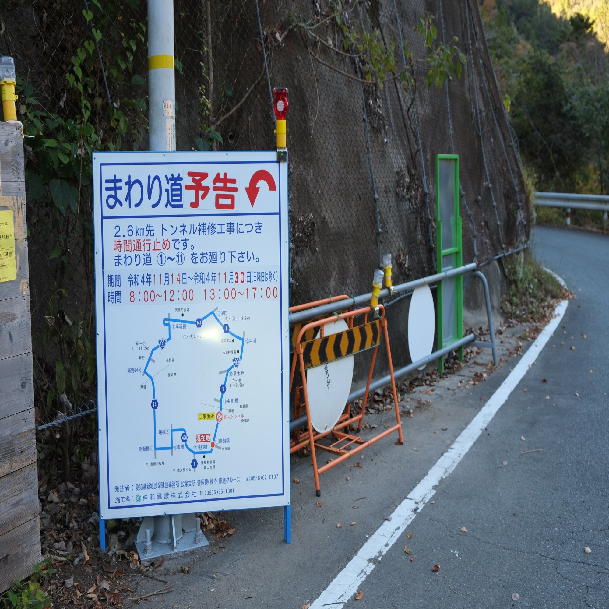 が、そんな計画も虚しく、天龍村からわずか20kmほど天竜川沿いを下ったJR飯田線の大嵐駅付近で通行止めに遭います。ちなみに、「大嵐」と書いて「おおぞれ」と読みます。