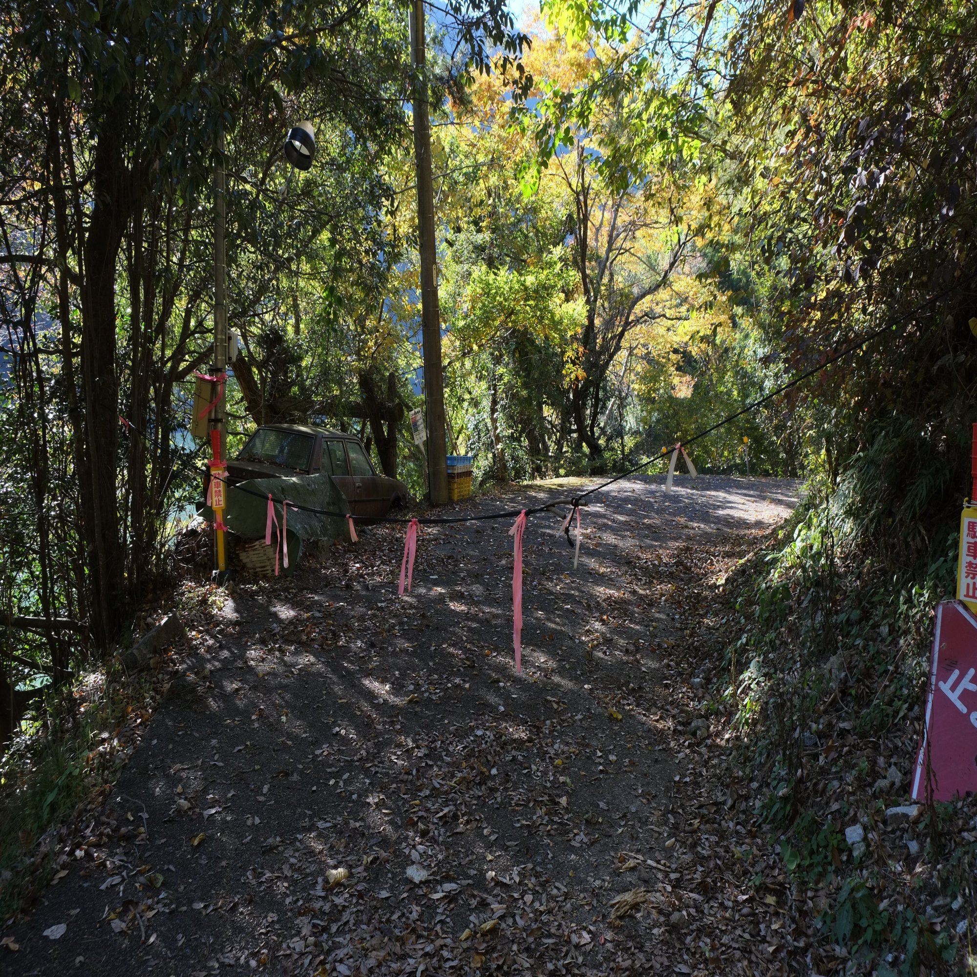 そして、トンネルの右手の少し急な坂を10メートルほど登ると、集落の入口とおぼしき場所に出ます。冒頭の車ともついにご対面。