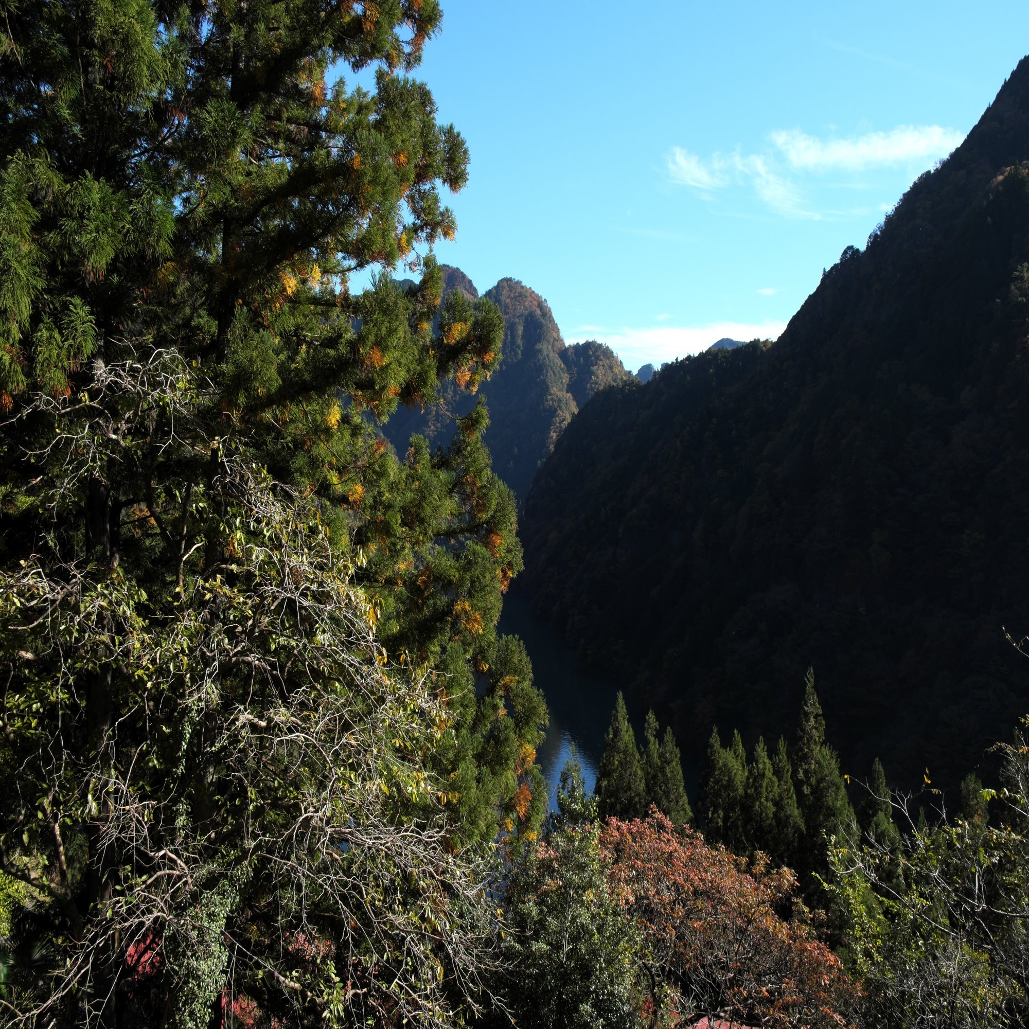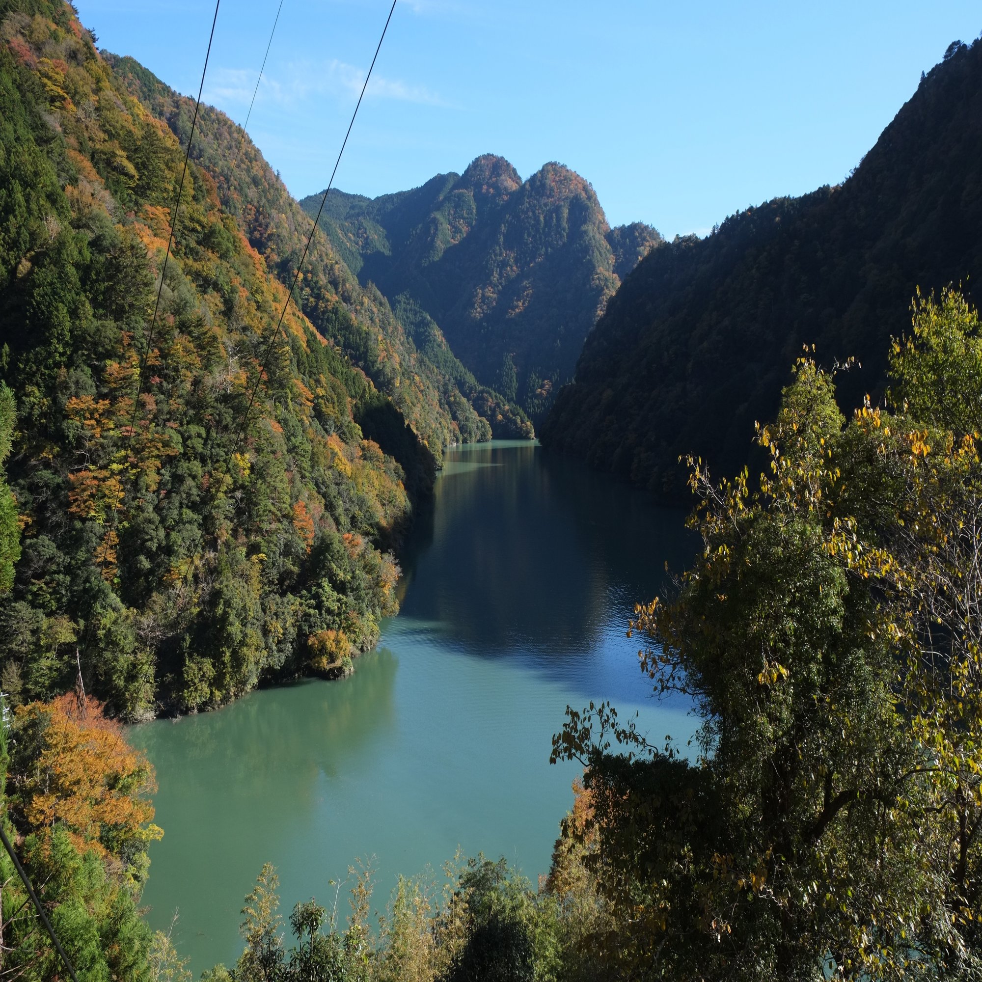ここまで登ってきた石段と山道を見下ろすと、眼下にはものすごい色の天竜川と紅葉のコントラストが広がっています。