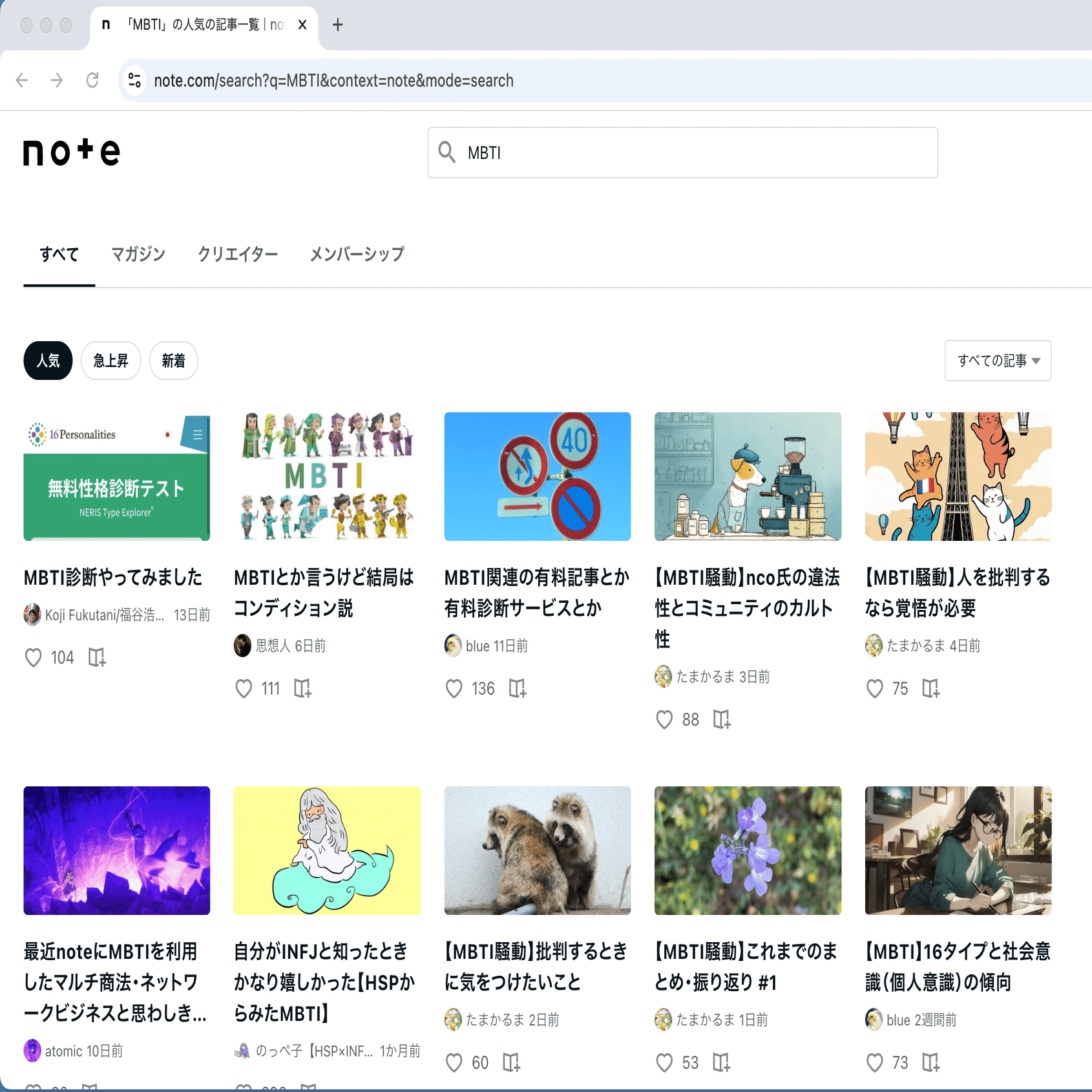 noteで「MBTI」と検索すると、MBTI騒動に関する記事がたくさん出てきます。
