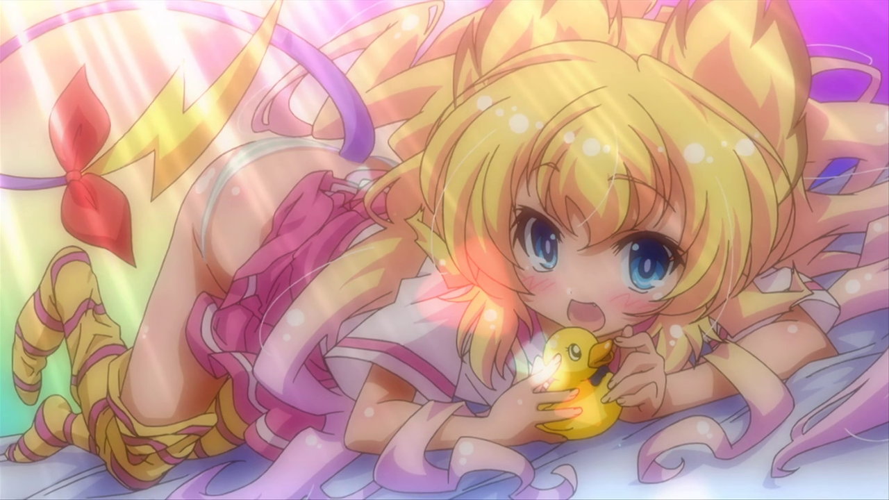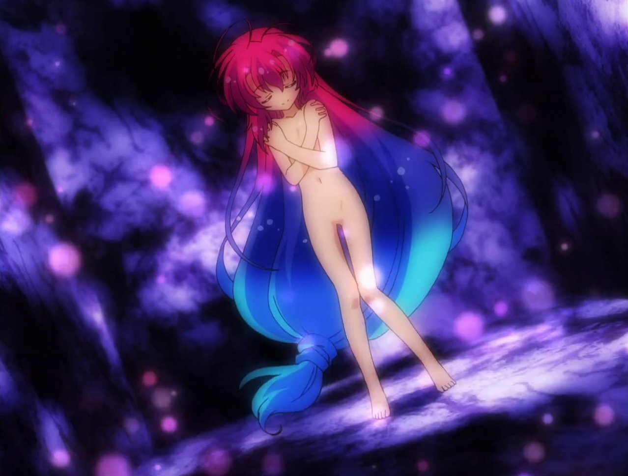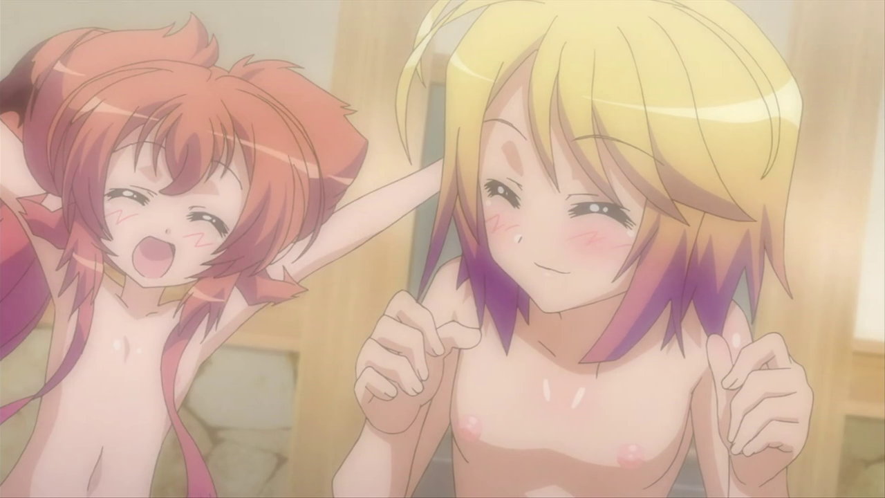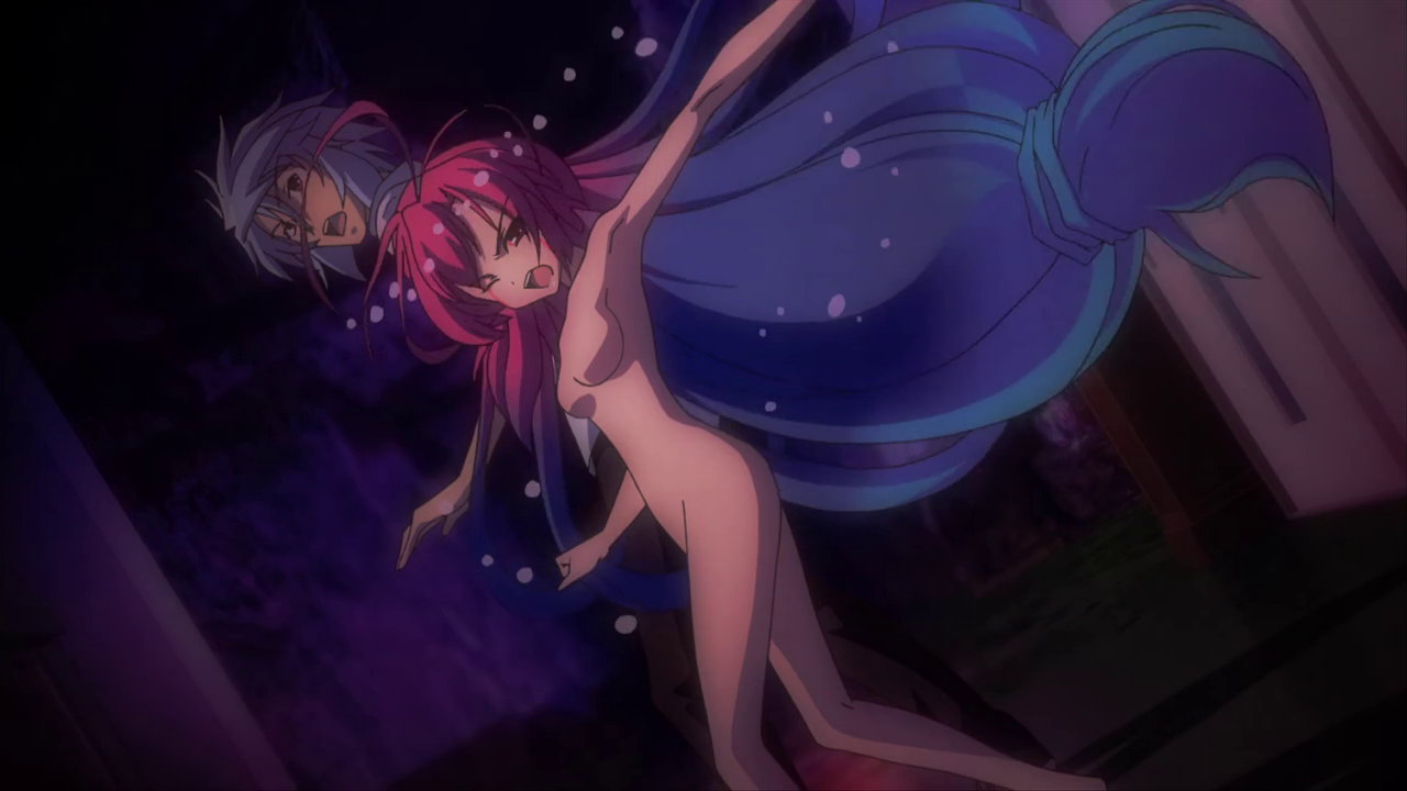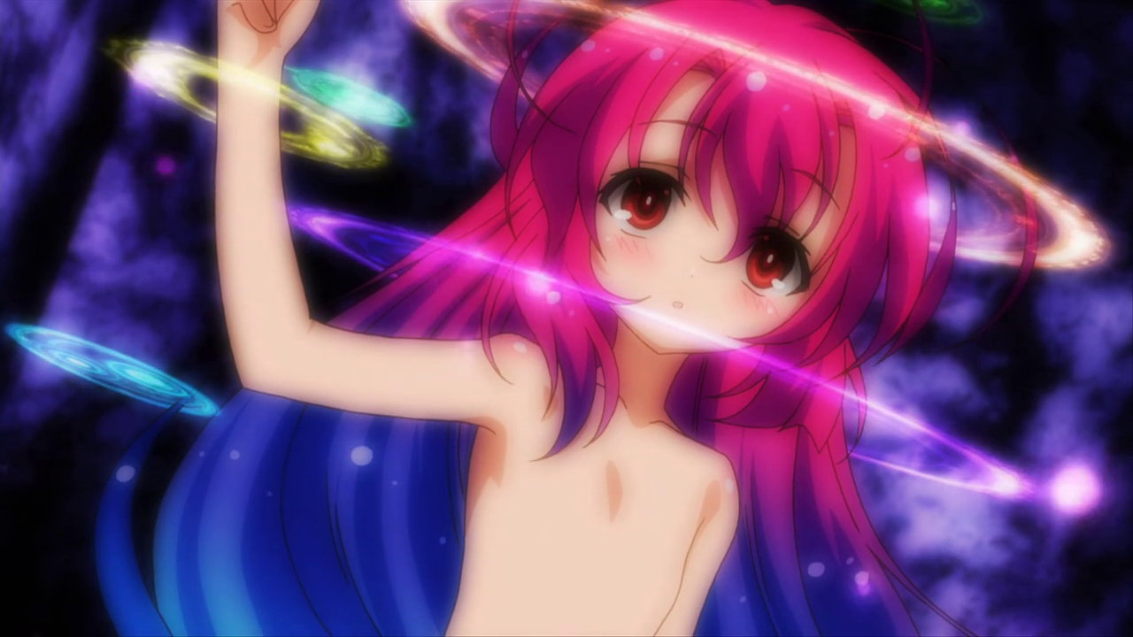 第13話:全裸のヒメア。持っている人形は、「伝説の勇者の伝説」の登場キャラクターであるライナおよびフェリス。