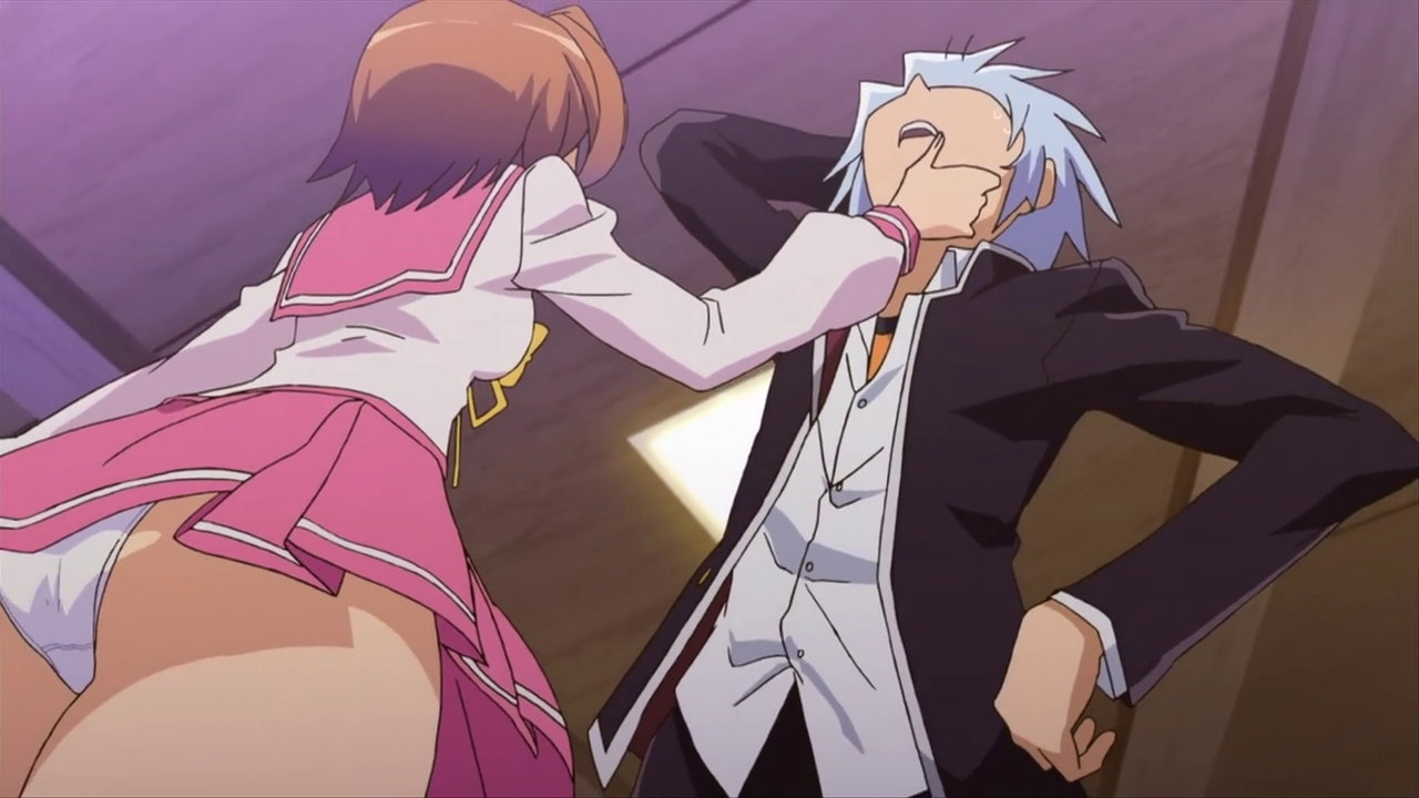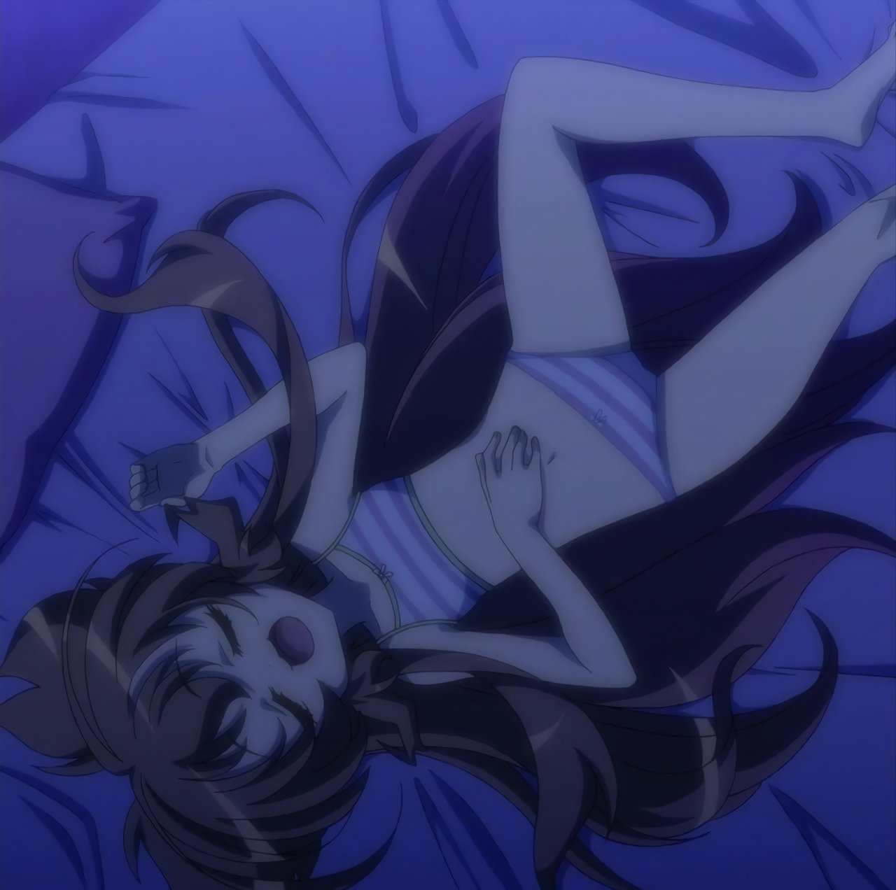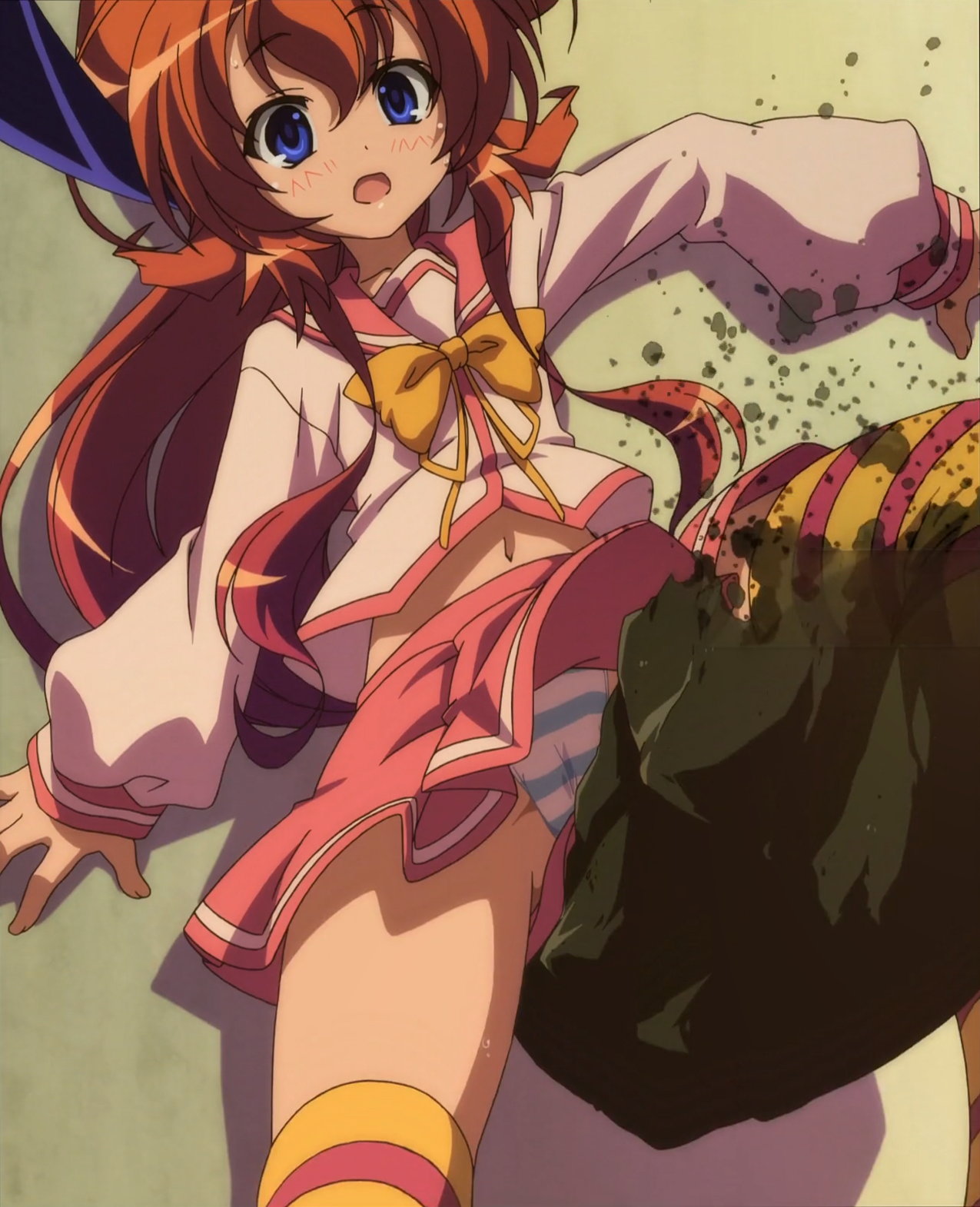 ヒメア(に入れ替わった美雷)を押し倒す、パンツ丸見えの遥。