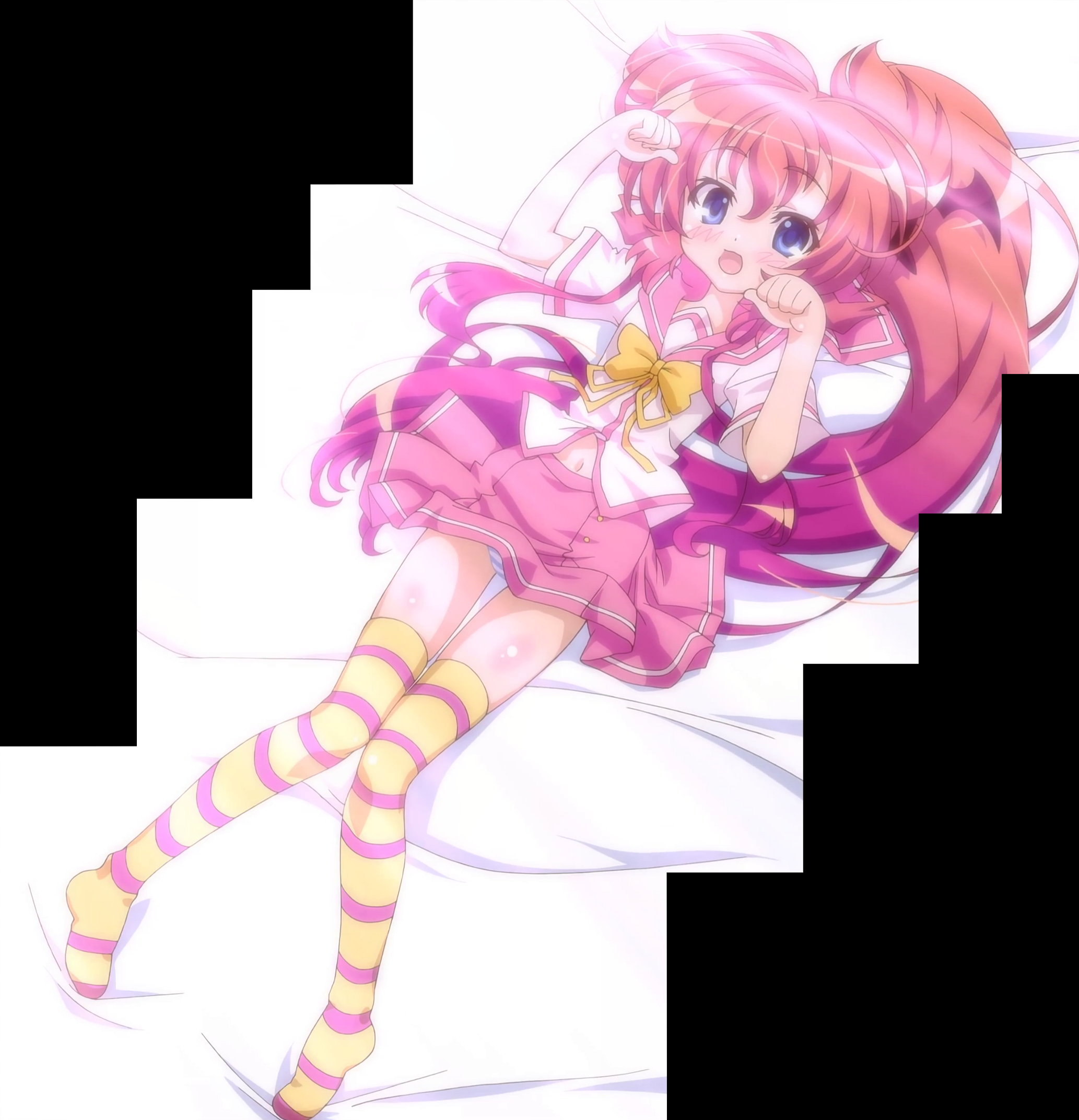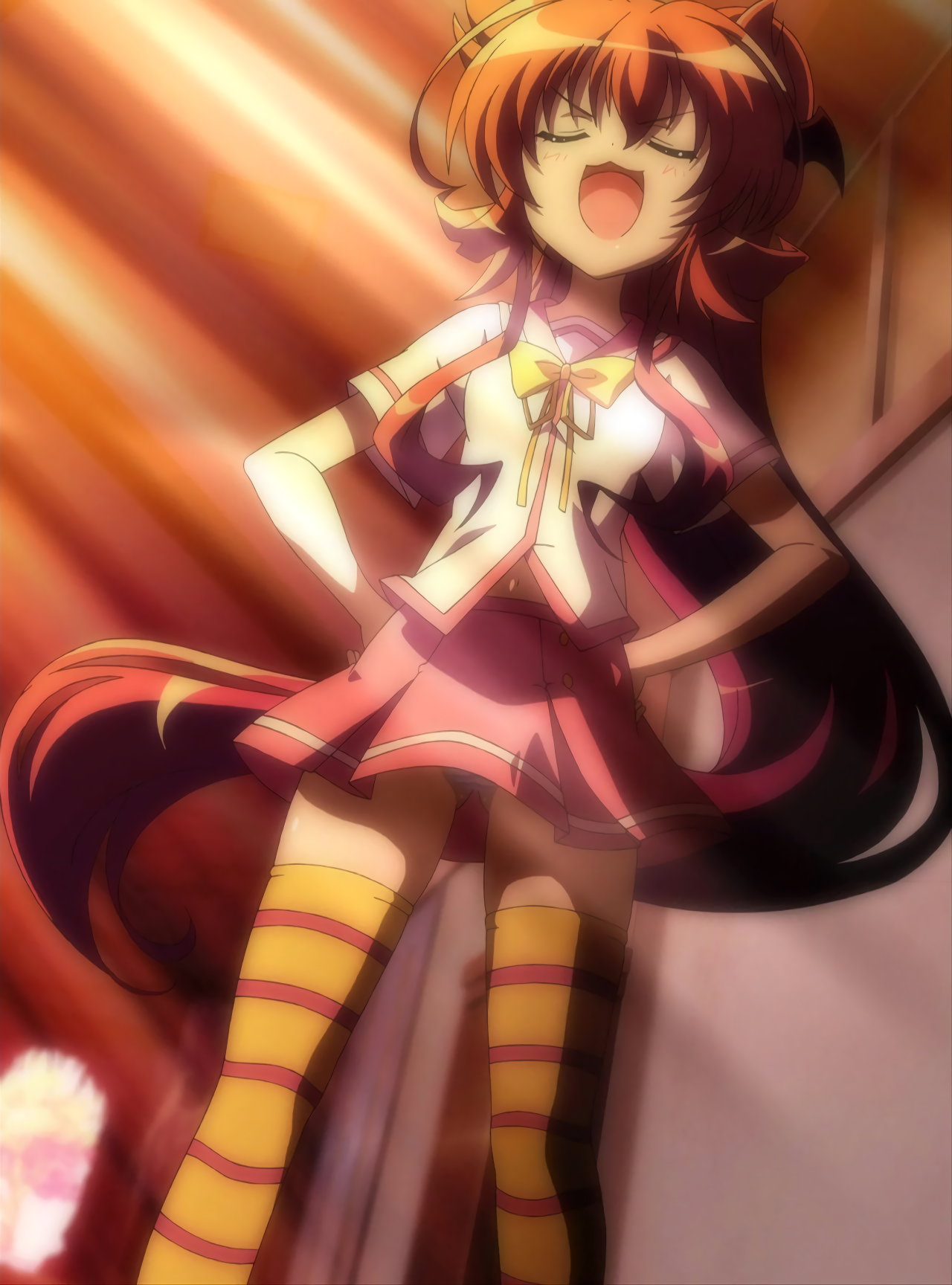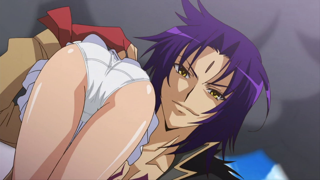 ヒメア(に入れ替わった美雷)を押し倒す、パンツ丸見えの遥。