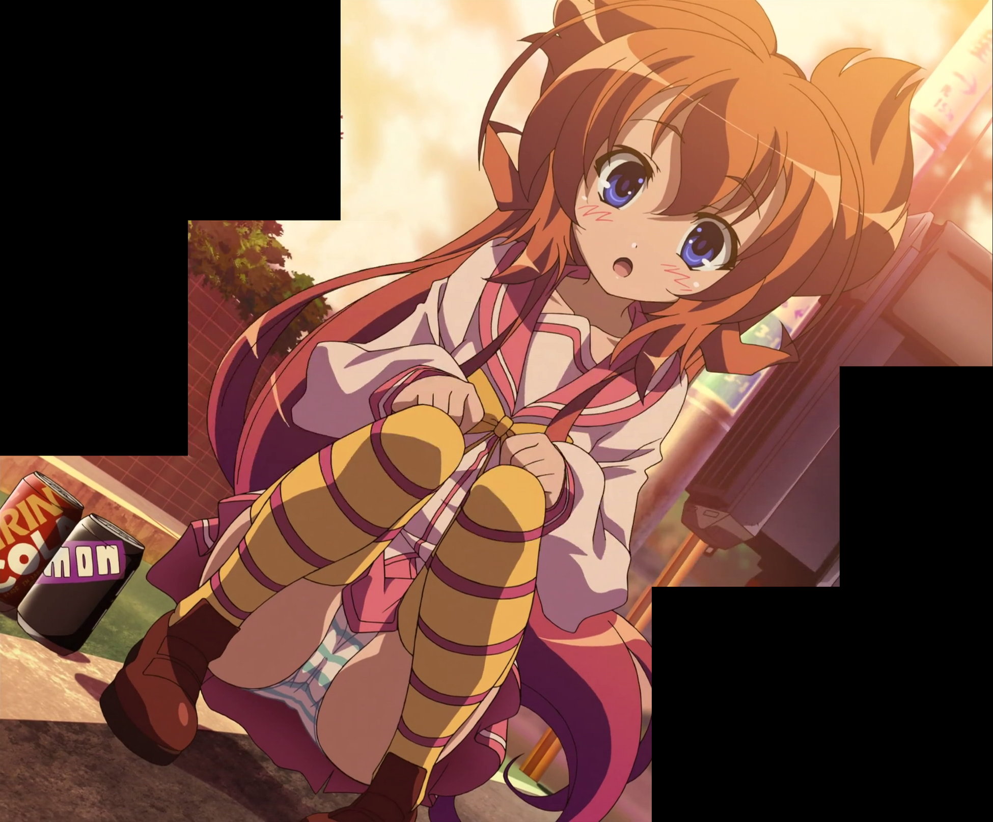 第6話:両手に缶ジュースを持ち、股を広げる、パンツ丸見えの美雷。