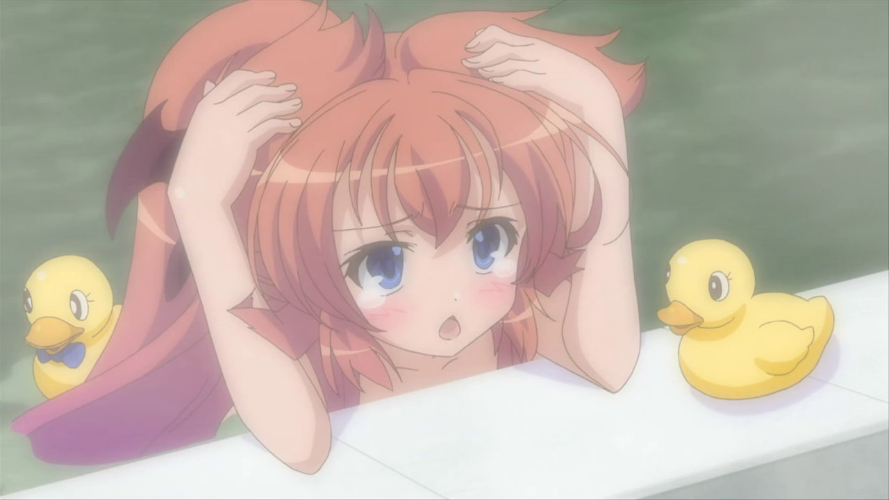入浴中、大兎に裸体を見られて赤面するユイカ。