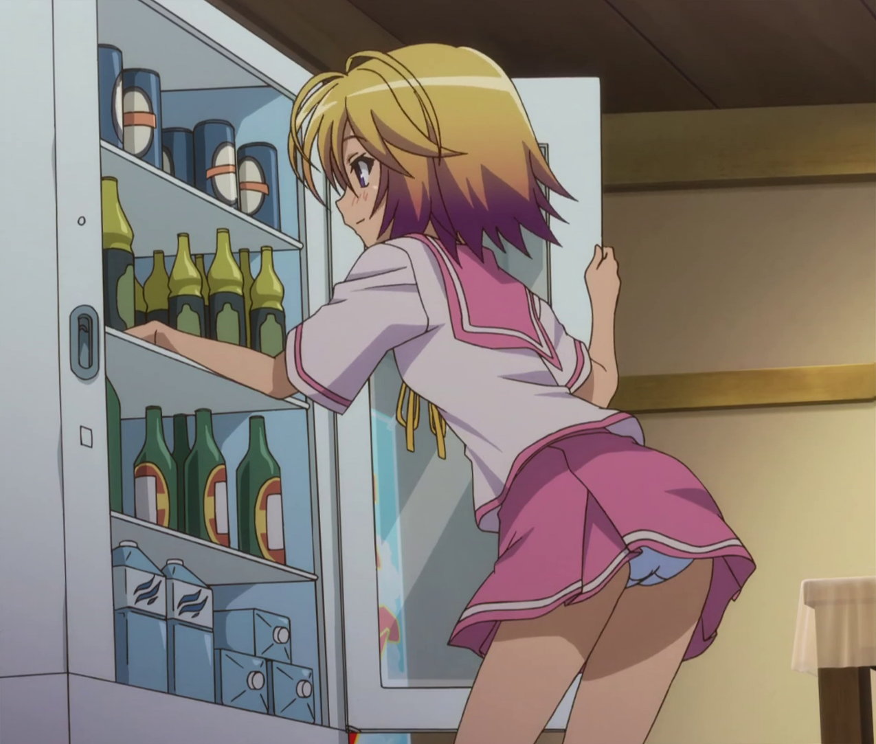パンチラしながら冷蔵庫を開ける泉。