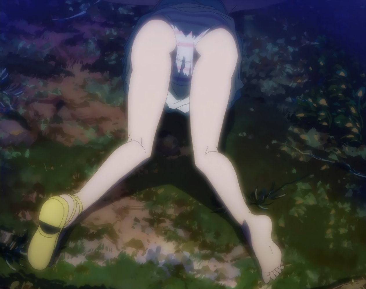 肝試しの最中、物音に怯えて、パンツ全開で走り出す美雷。