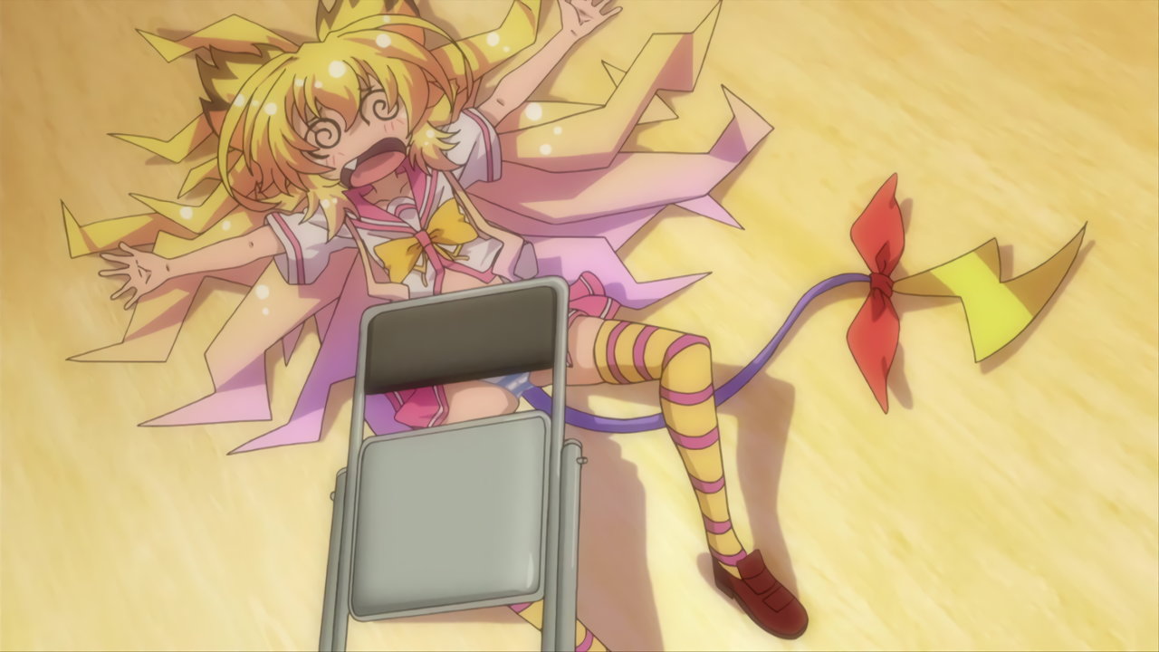 パンツ全開で戦い、椅子にぶつかってコケる美雷。