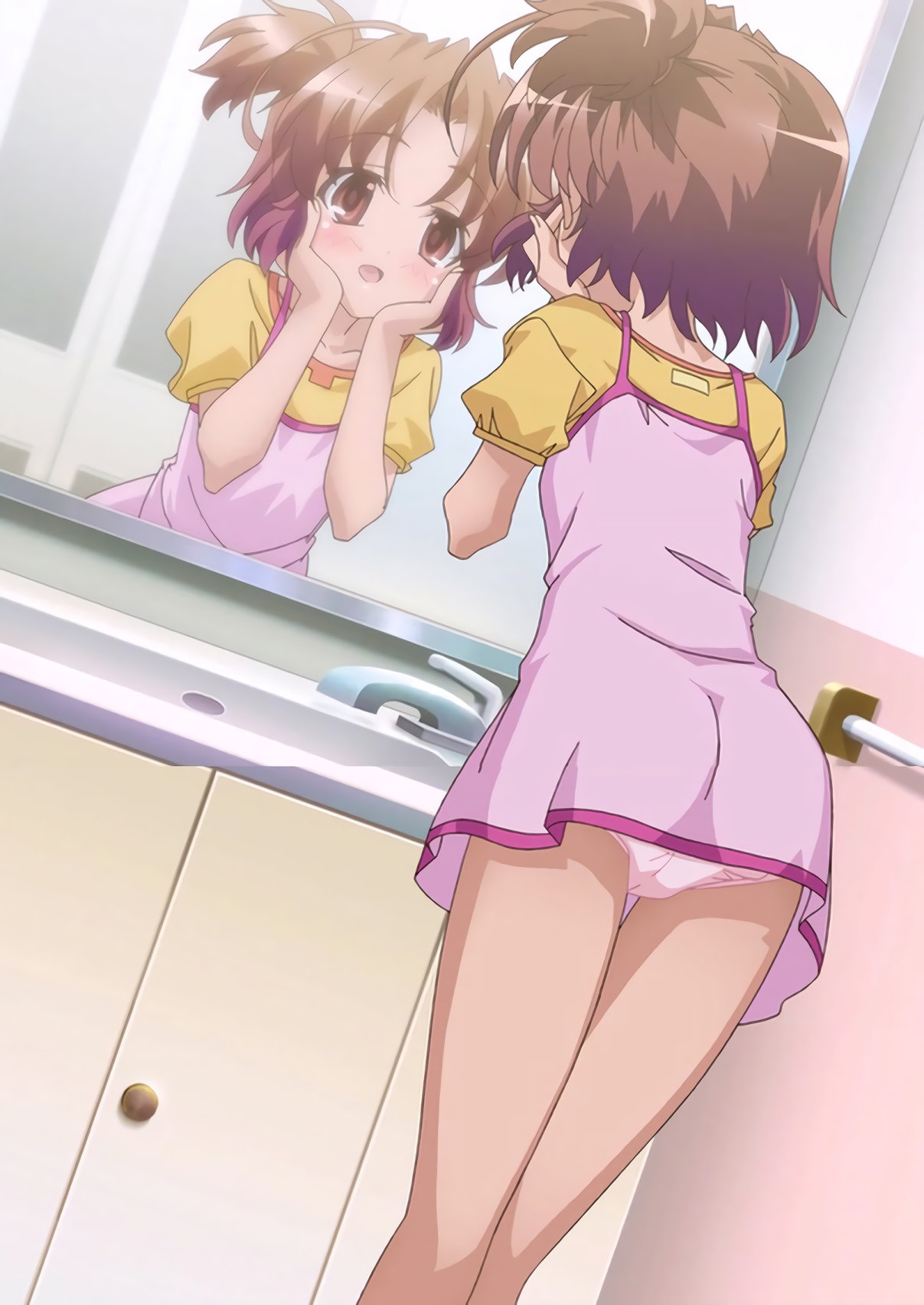 風呂上りに洗面台にて、パンチラしながら肌の手入れをするユイカ。