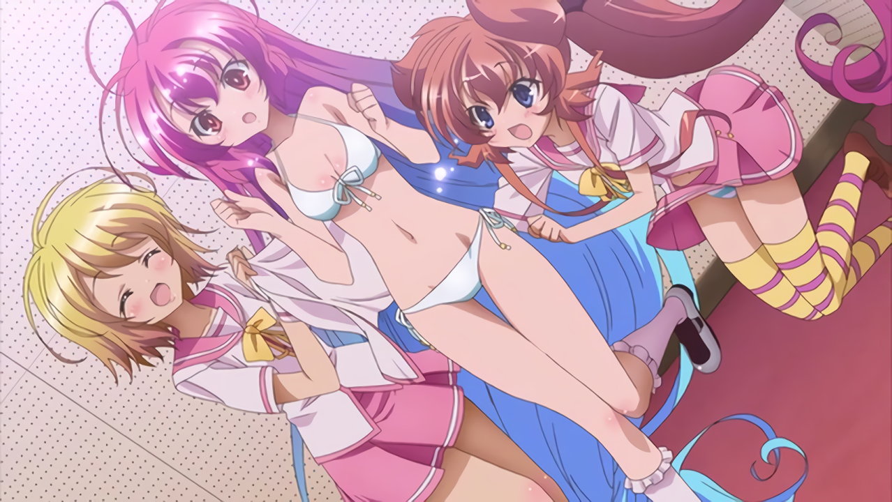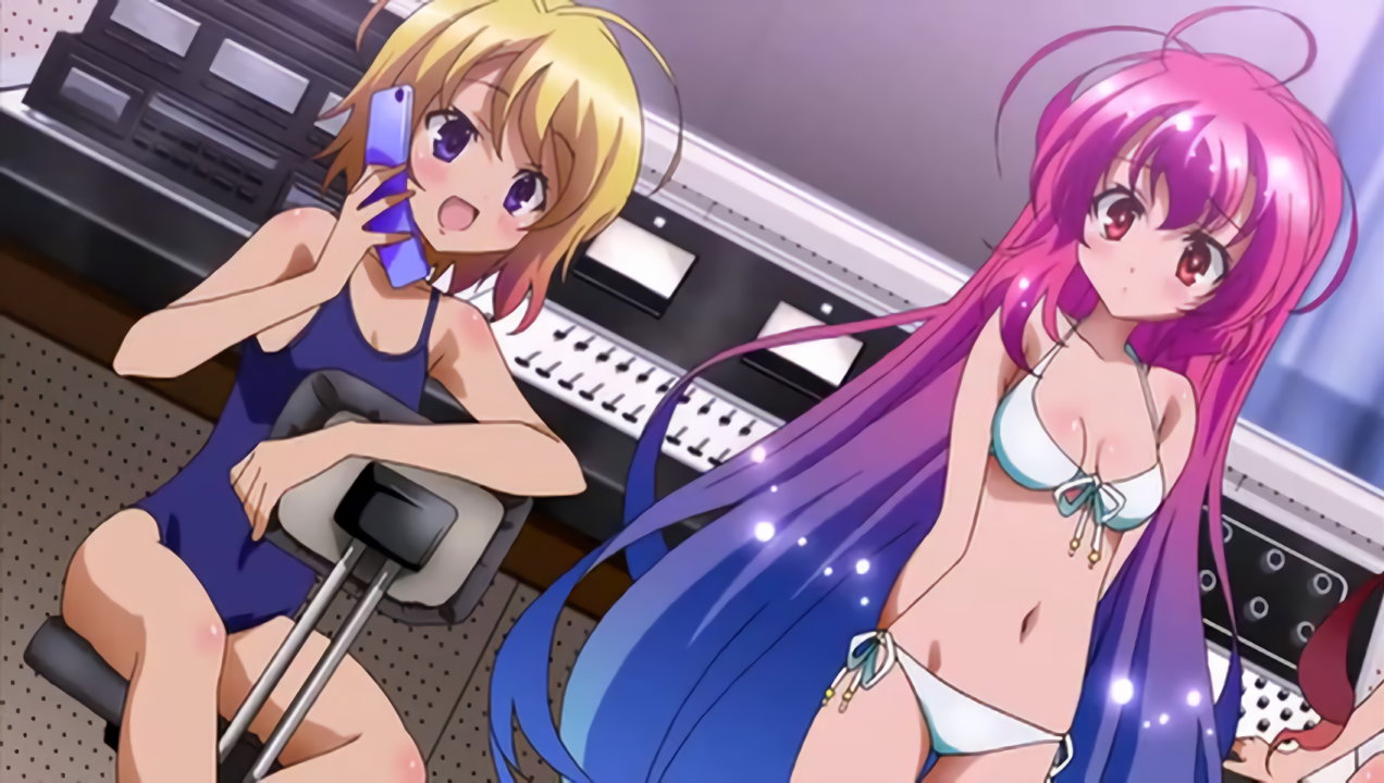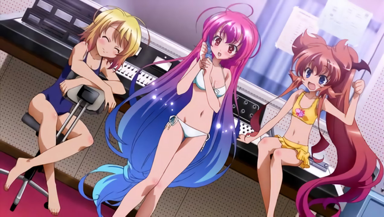放送室にて水着姿になる、泉、ヒメア、美雷。