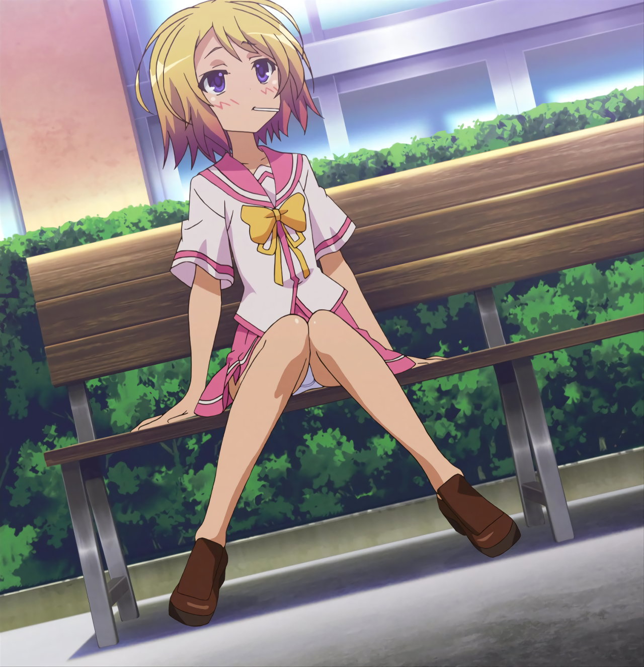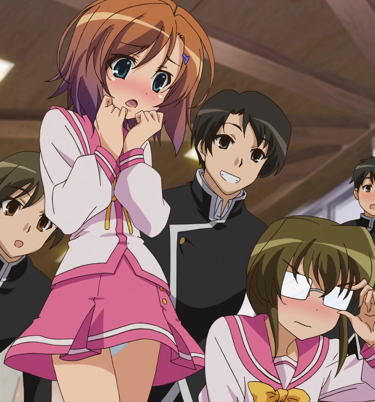 赤面しパンチラする遙。