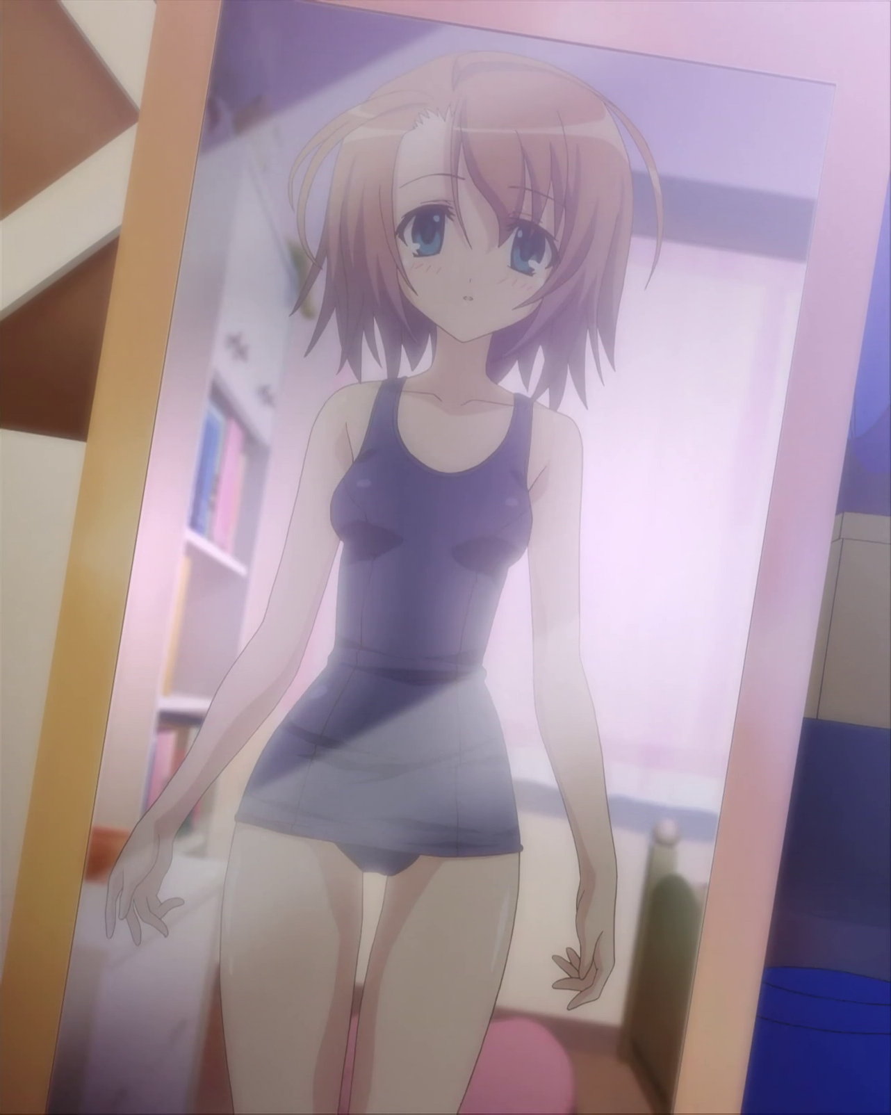 スクール水着を試着し、鏡に写った自分の姿を見る遙。