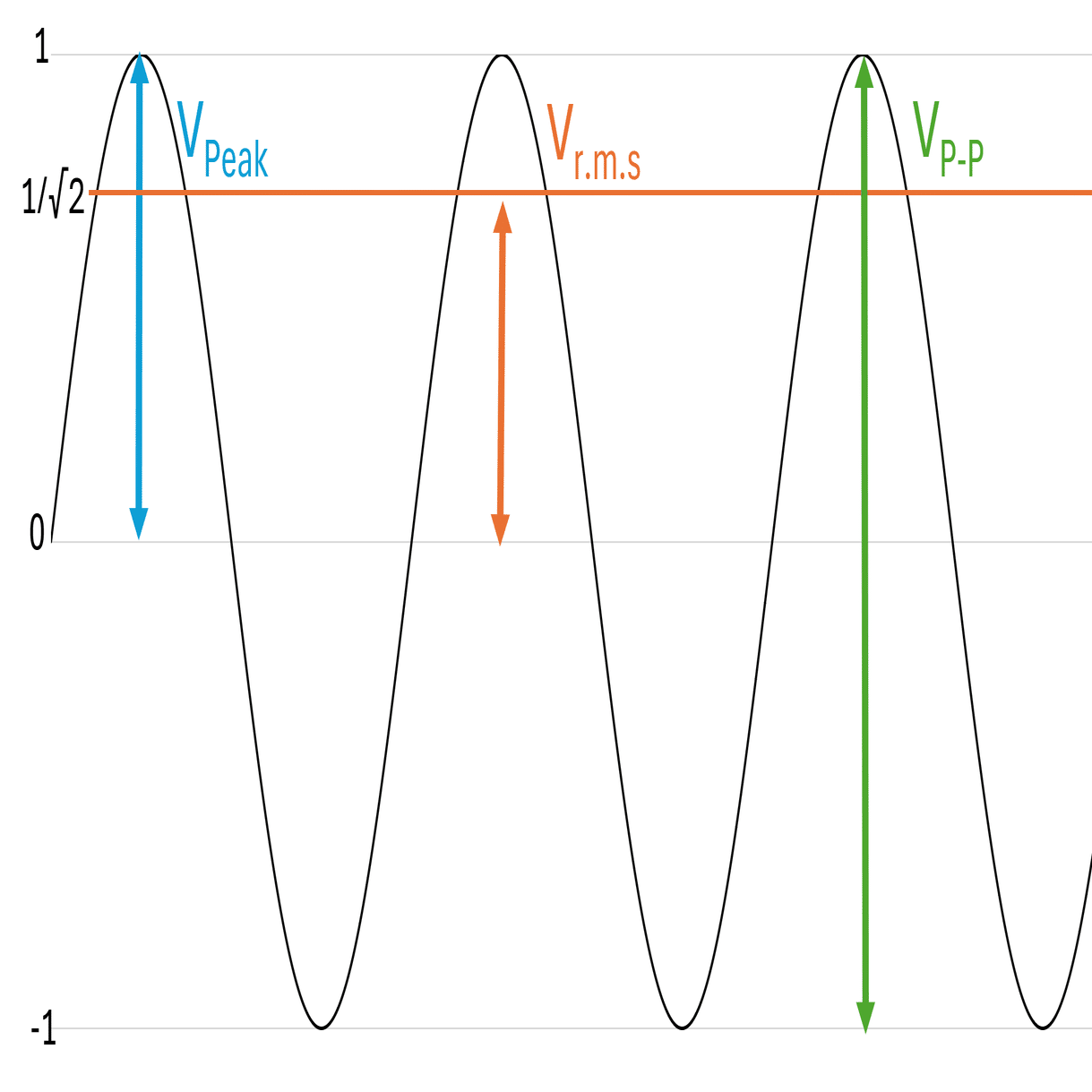 と定義されています。ここで、\mathrm{[V_{r.m.s.}]} は電圧の実効値 を表しています。 交流信号を扱う場合、示す電圧がピーク値\mathrm{[V_{Peak}]} 、実効値\mathrm{[V_{r.m.s.}]} 、ピークtoピーク値\mathrm{[V_{P-P}]} のどれであるかを意識する必要があります。サイン波の場合、実効値はピーク値の1/\sqrt{2} 倍とされており、以下の図のような関係にあります。