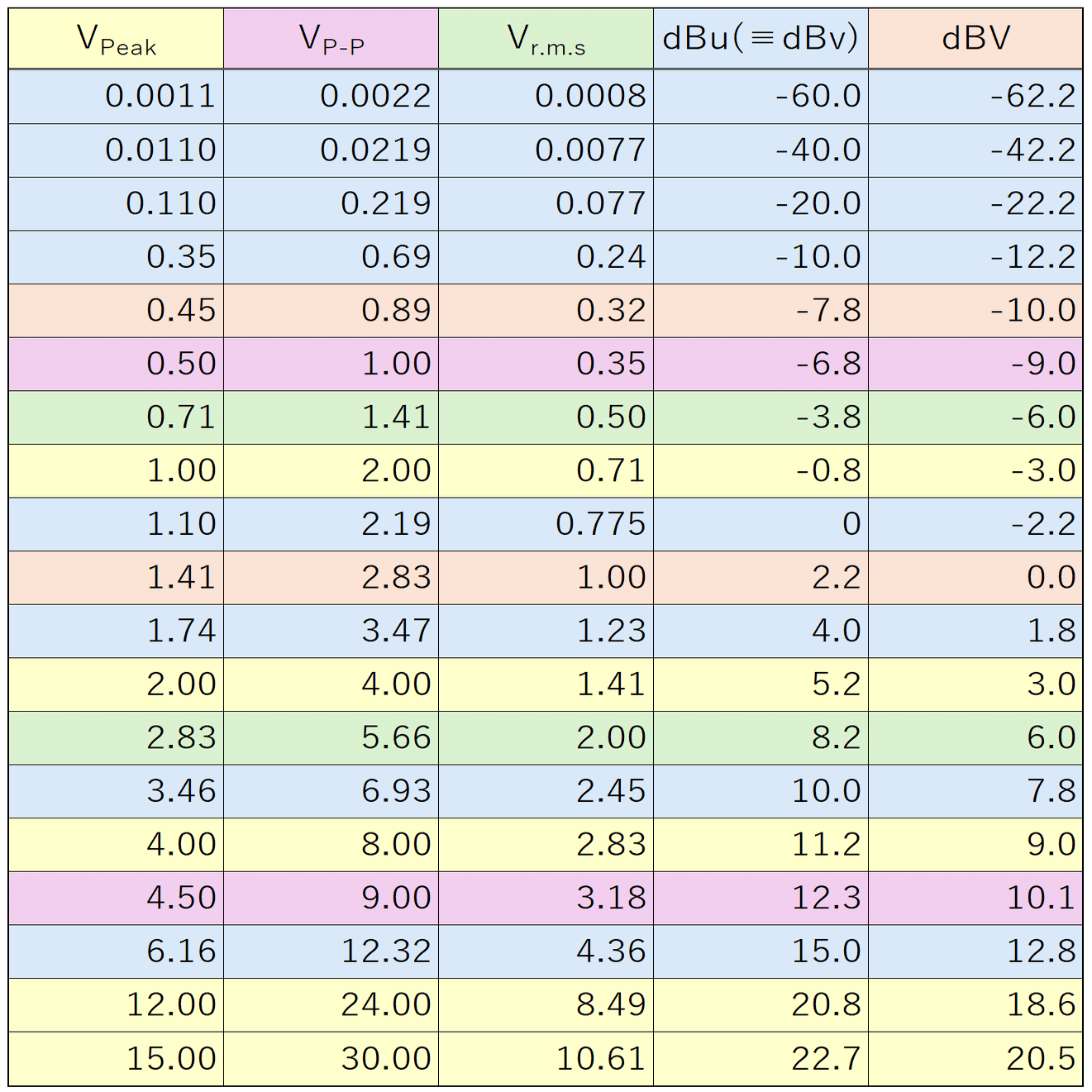 電圧-デシベル変換早見表、単位と行の色が対応しているところはキリのいい数値となっている。なお、端数は四捨五入しています。 最後に 内容自体はかなり数学的なものだと思いますが、エフェクター製作やDTM、PA、レコーディングでは必須知識だと思います。一度で理解できなくても何度も読み返したり、高校数学を復習して、着実に身に着けて頂ければ幸いです。最後までお読みいただきありがとうございました。