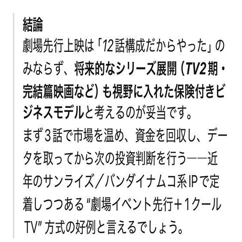 ちなみに、ChatGPTにジークアクス劇場版のビジネスモデルを質問をした際に、続編の可能性は高いとも予想していました。
