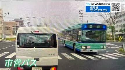 さらに、4月に仙台市宮城野区で撮影された映像。赤信号で右折専用の矢印が出ました。既に右折を始めている車もいます。そんな中、交差点に直進で進入してきた車両があります。何と仙台市営バスです。