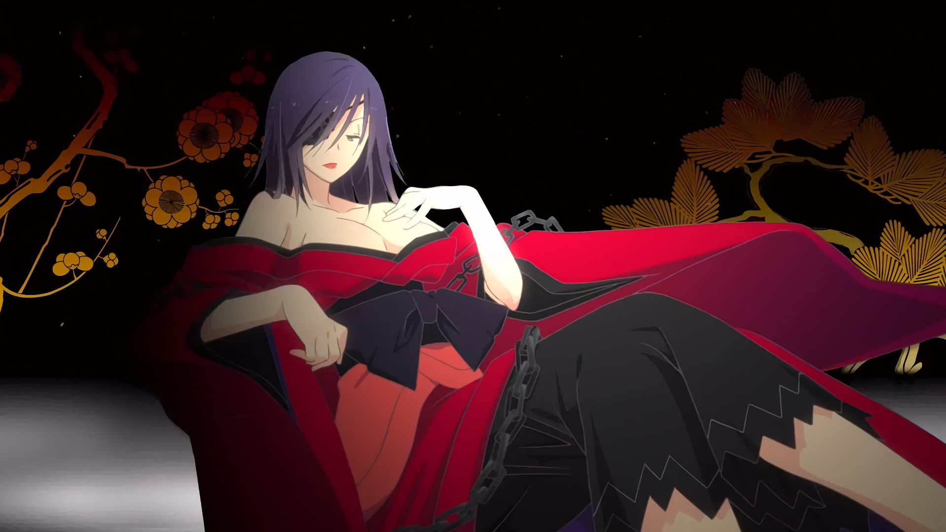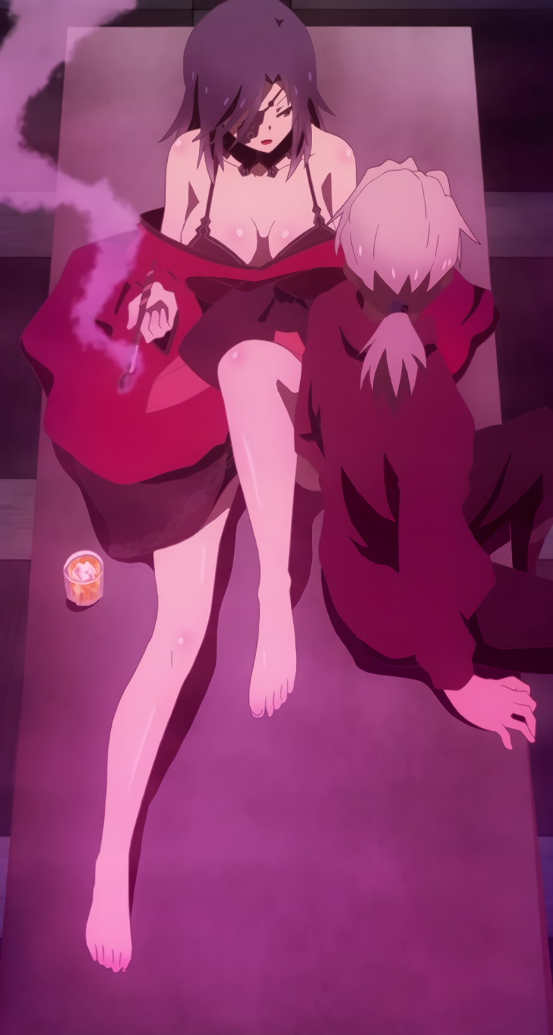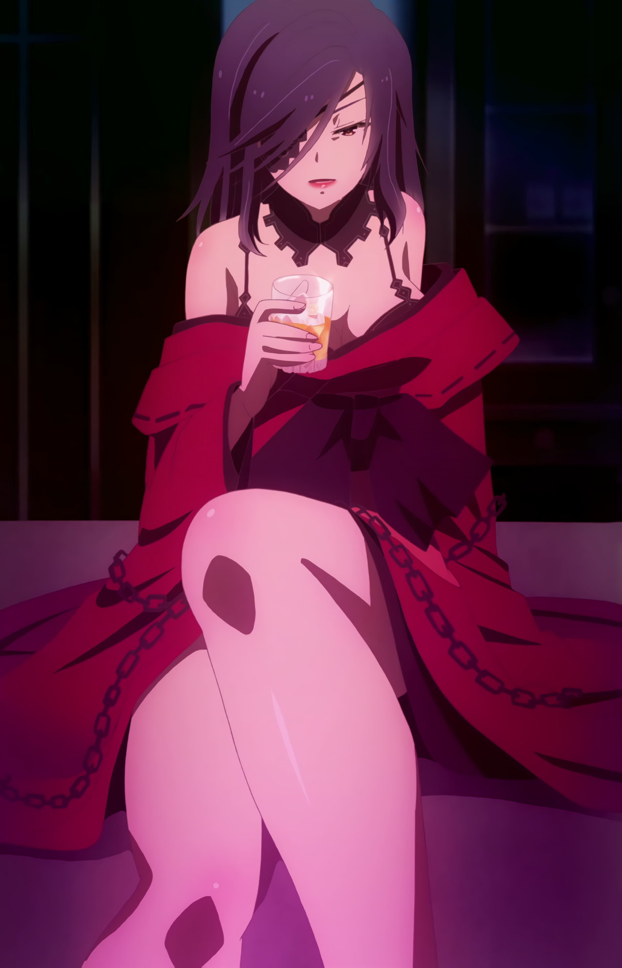 着物を着崩し胸と生脚を見せつつ、酒と煙草を嗜む硝子。彼女と絡み合うクルーエル。