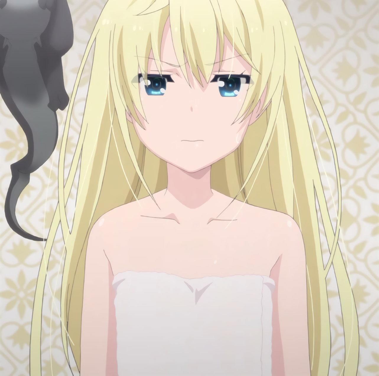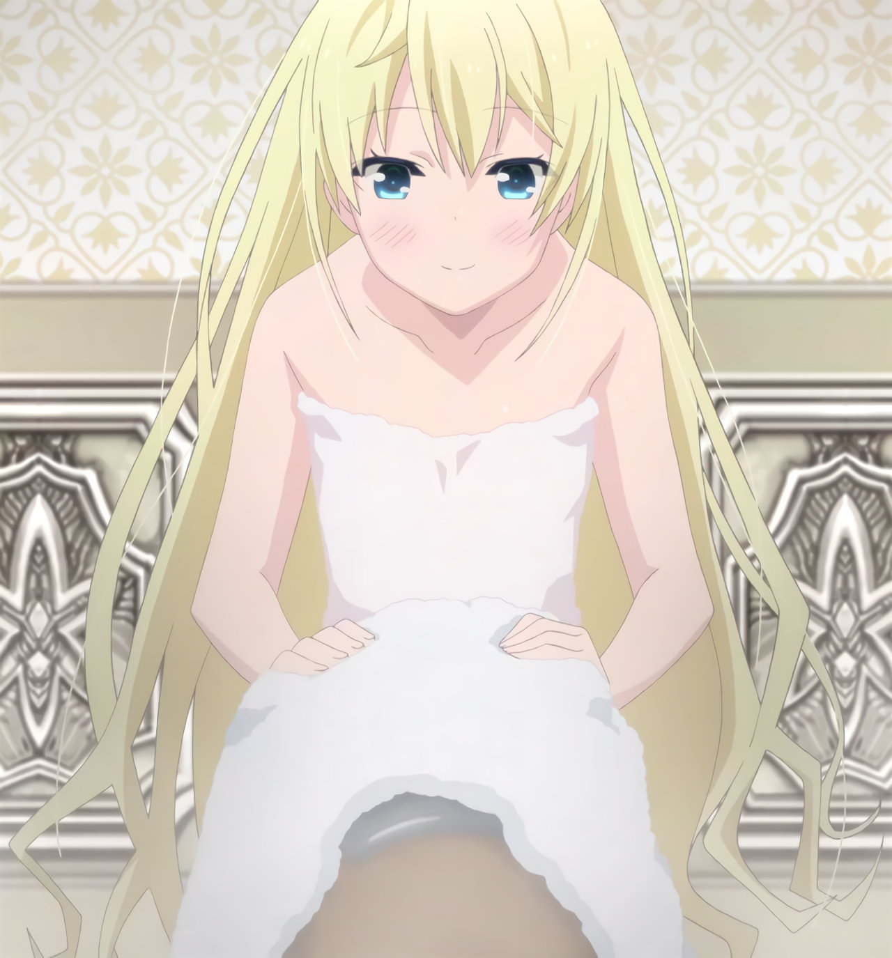 服を濡らしてベッドに横たわり、あざとい笑顔でハニートラップを仕掛けるフレイ。