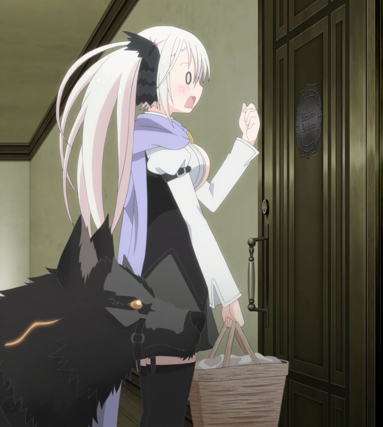 シャルロットの部屋の風呂場を借りて、使役犬を洗う全裸のフレイ。その巨乳を妬む、裸バスタオル姿のシャルロット。