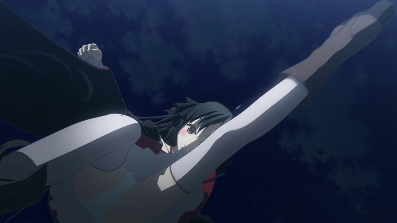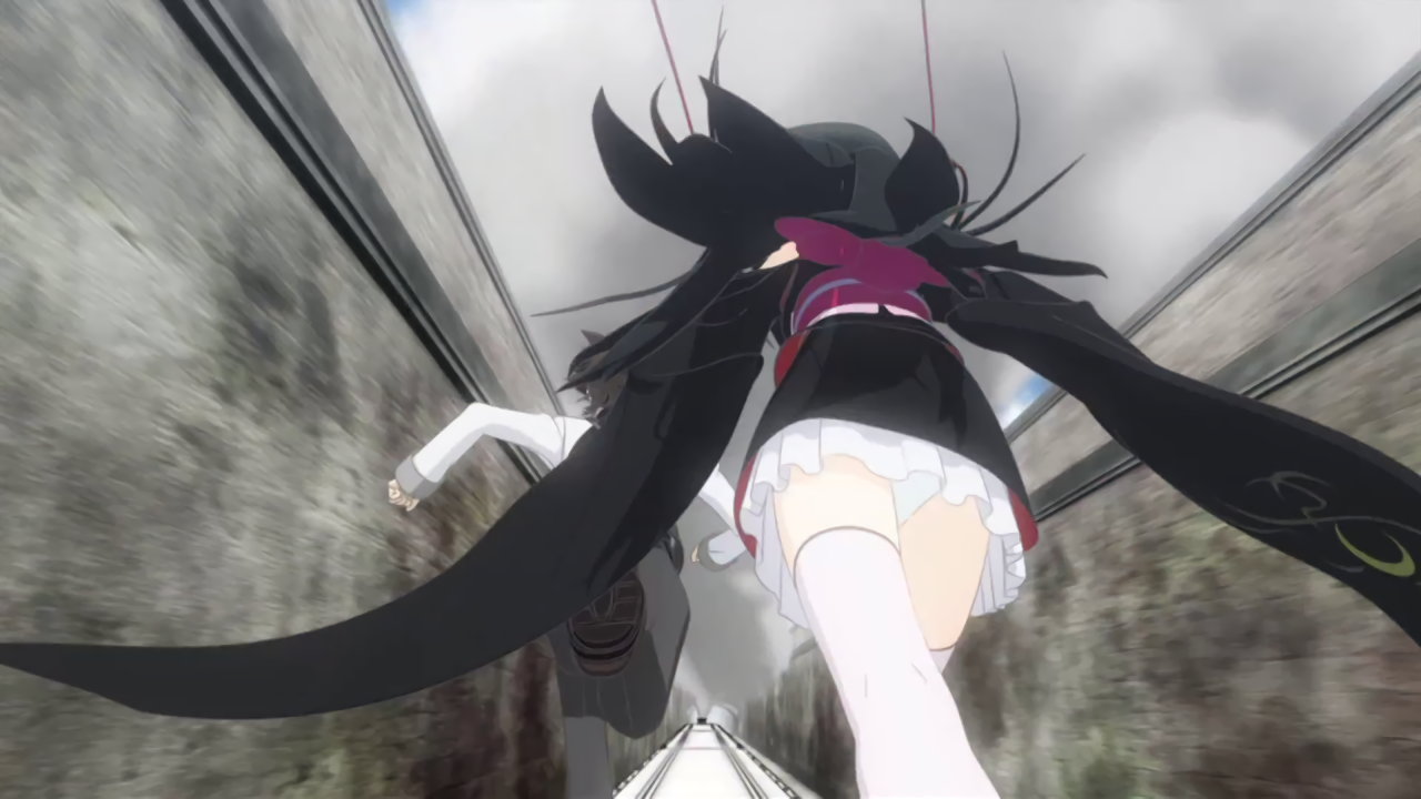 暴走する汽車を止めるべく、機関車へと向かう夜々。パンチラしながら客車の屋根を駆け抜ける。