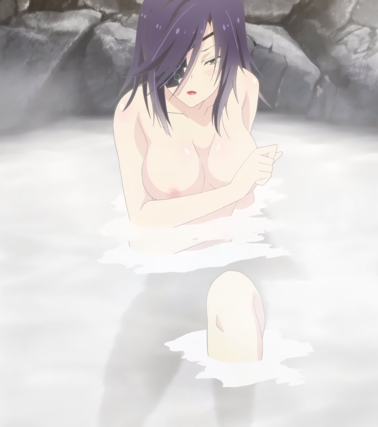 露天風呂で酒を飲みつつ、いろりと小紫の乳房を鑑賞する硝子。