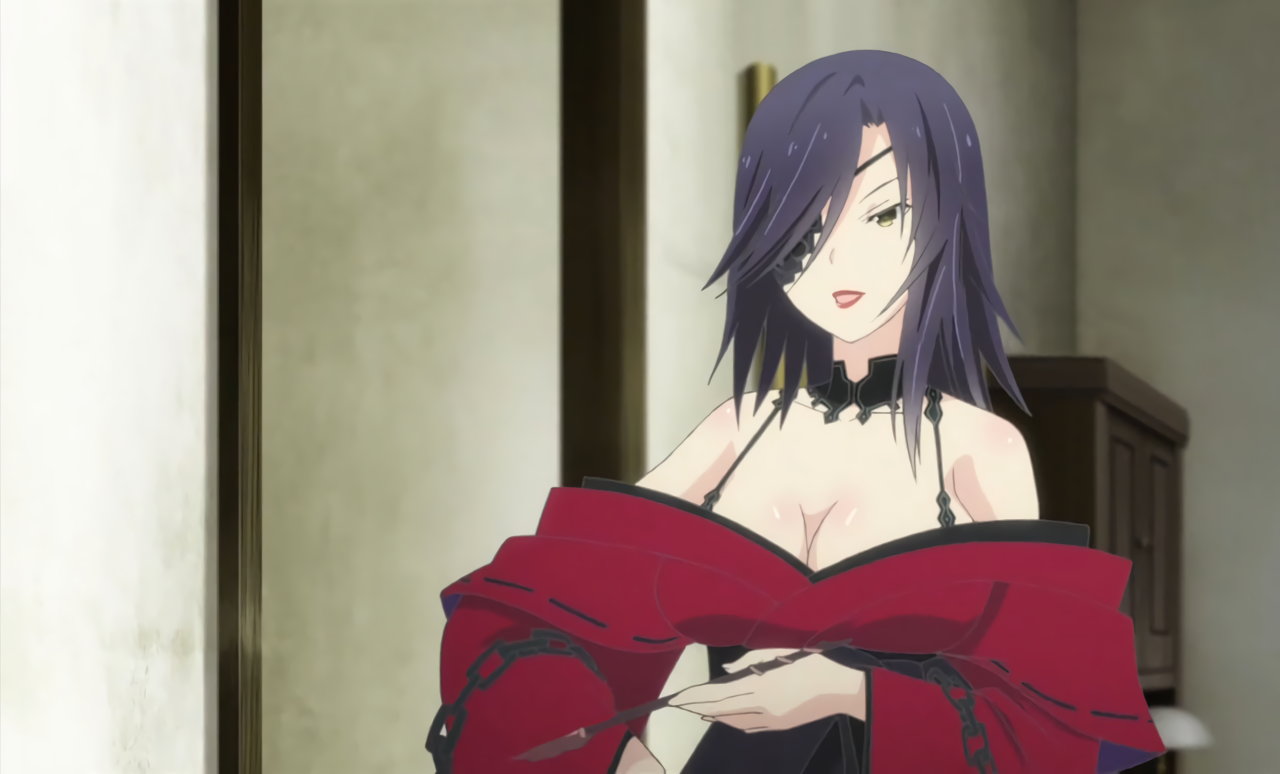 肩と巨乳の谷間を露出させるフレイ。その巨乳に嫉妬する夜々。