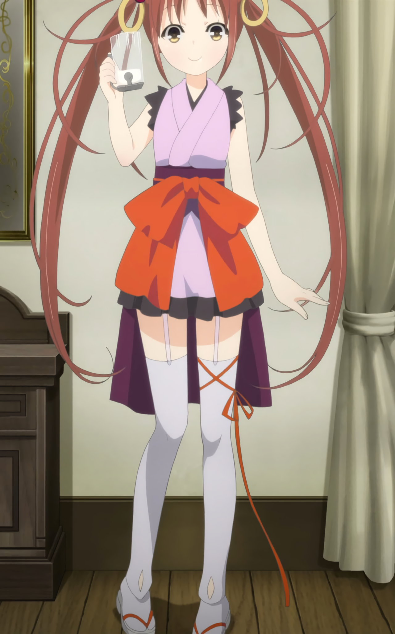 着物を着崩して胸の谷間を見せつつ、煙管を握る硝子。