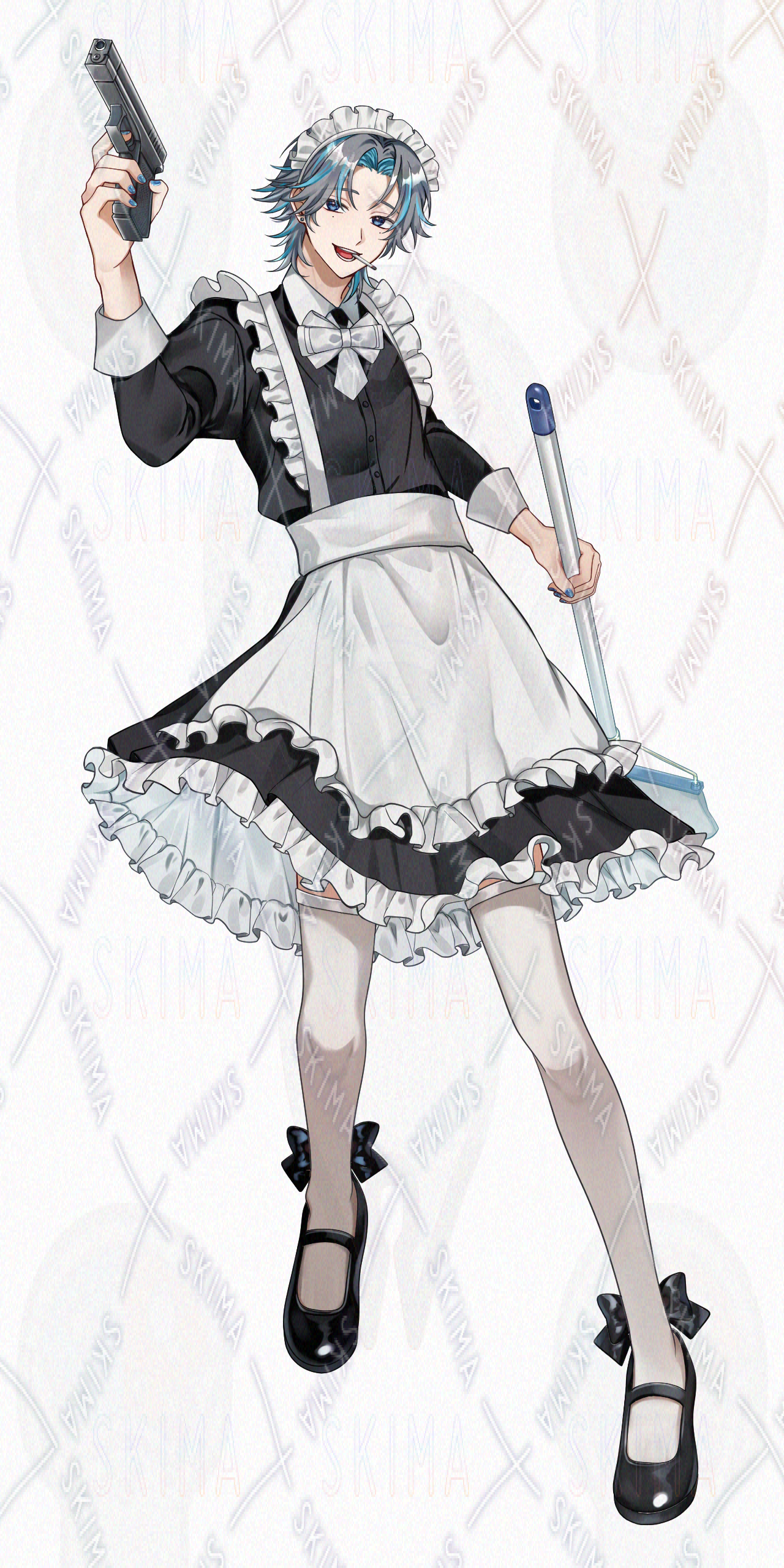 【表情6種】拳銃とモップを持った長身メイド男