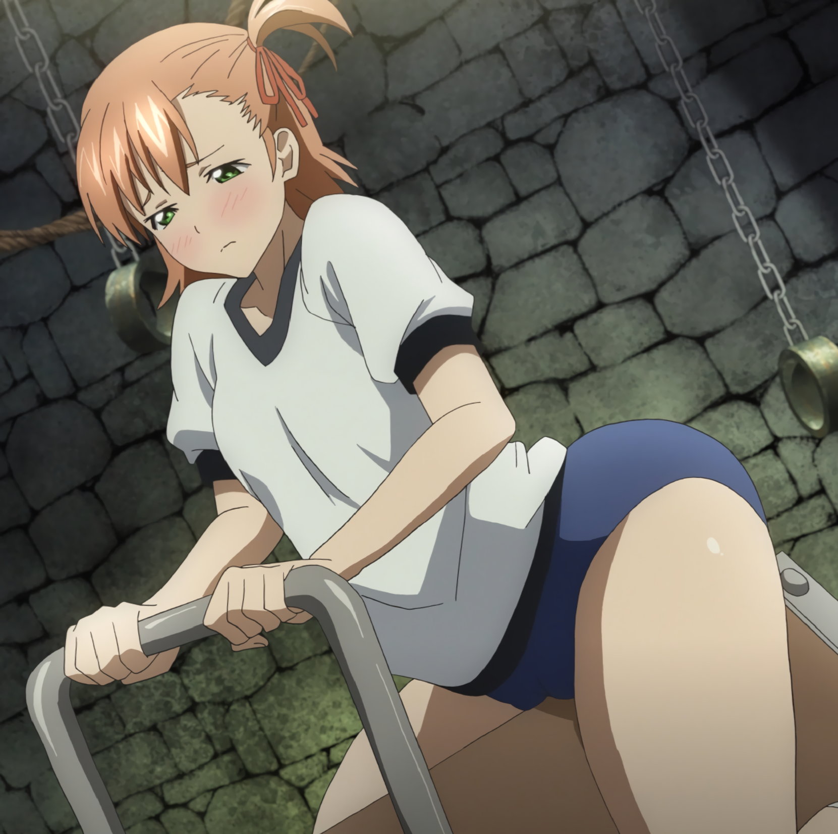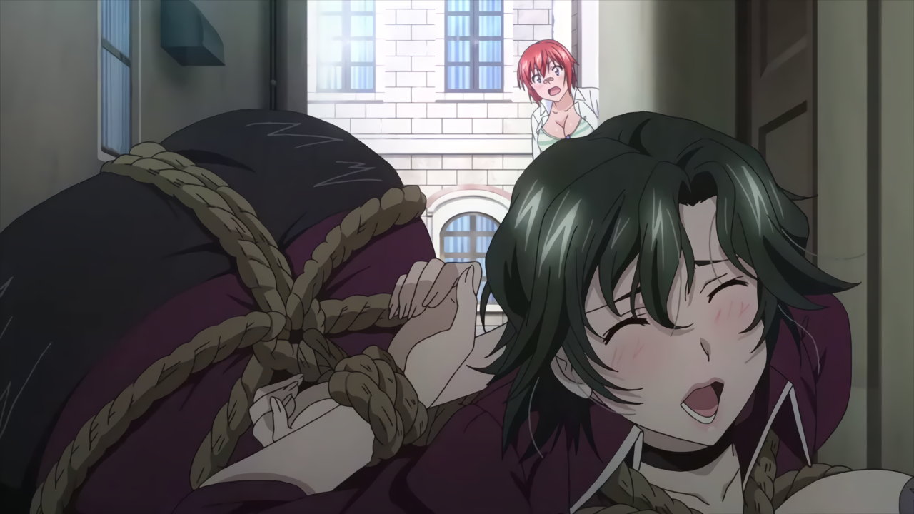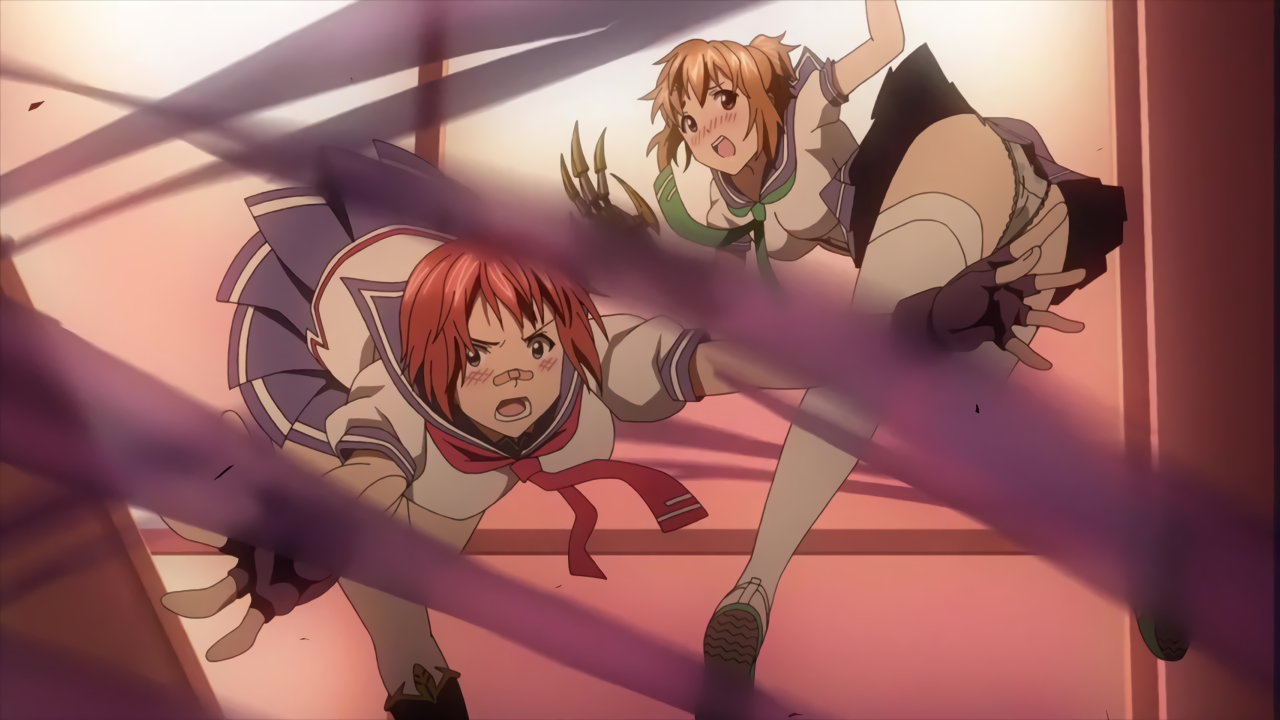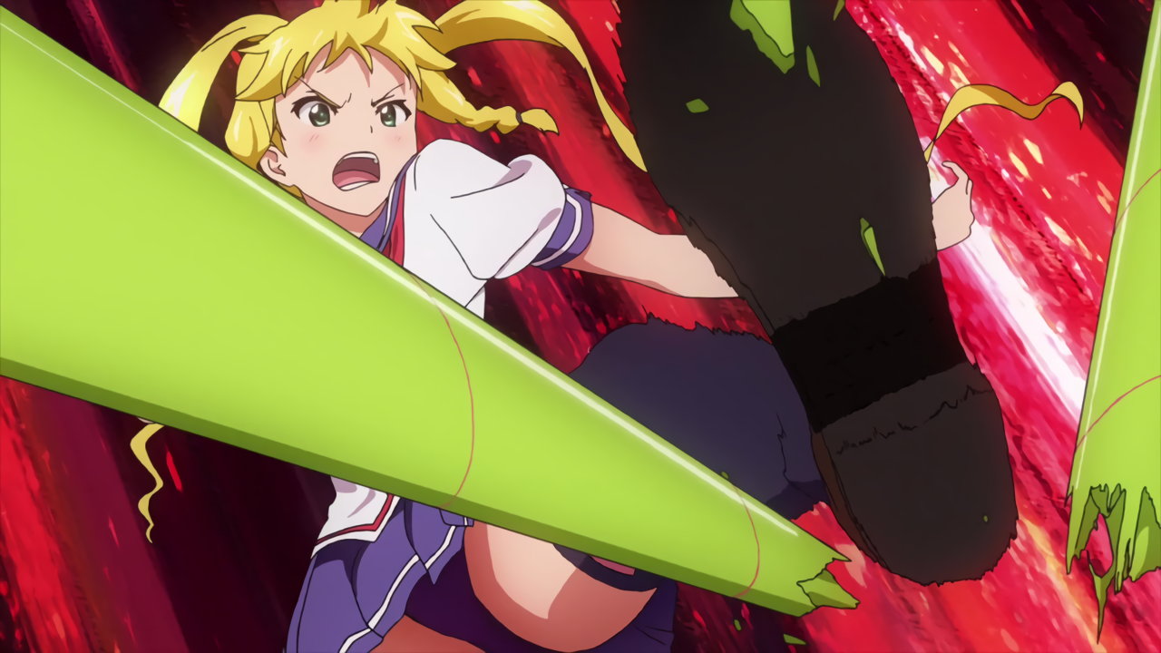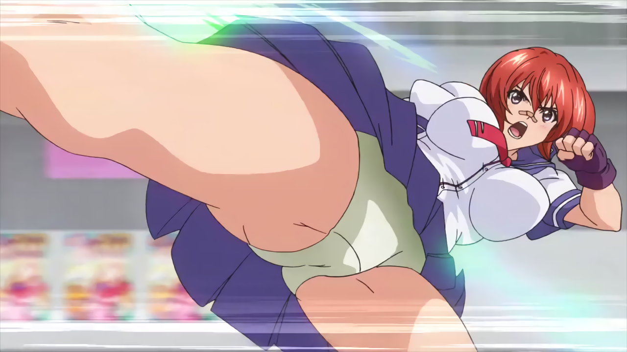 校内に侵入した強盗犯・霜柳まひるを追い詰めるアズキ。パンチラしつつ右脚の魔腱・リープを発動させる。