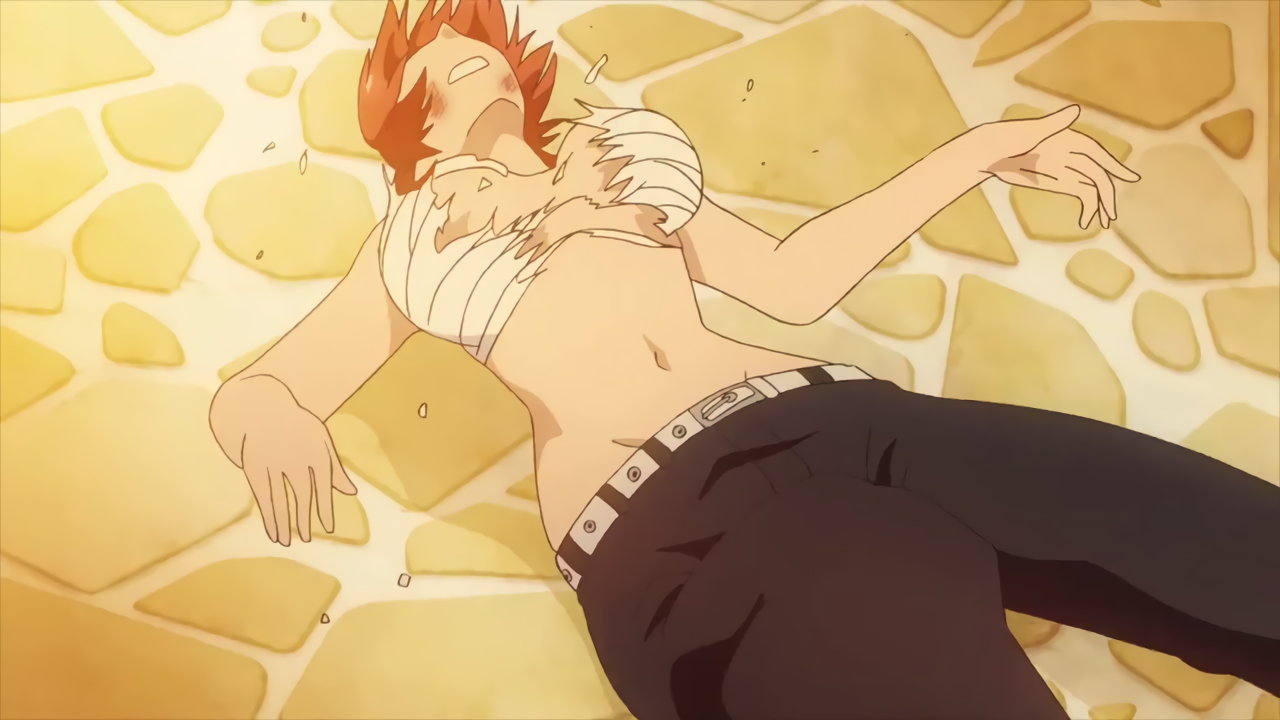 不良達との喧嘩中に倒れるアズキ。晒が破れ、上半身裸になる。