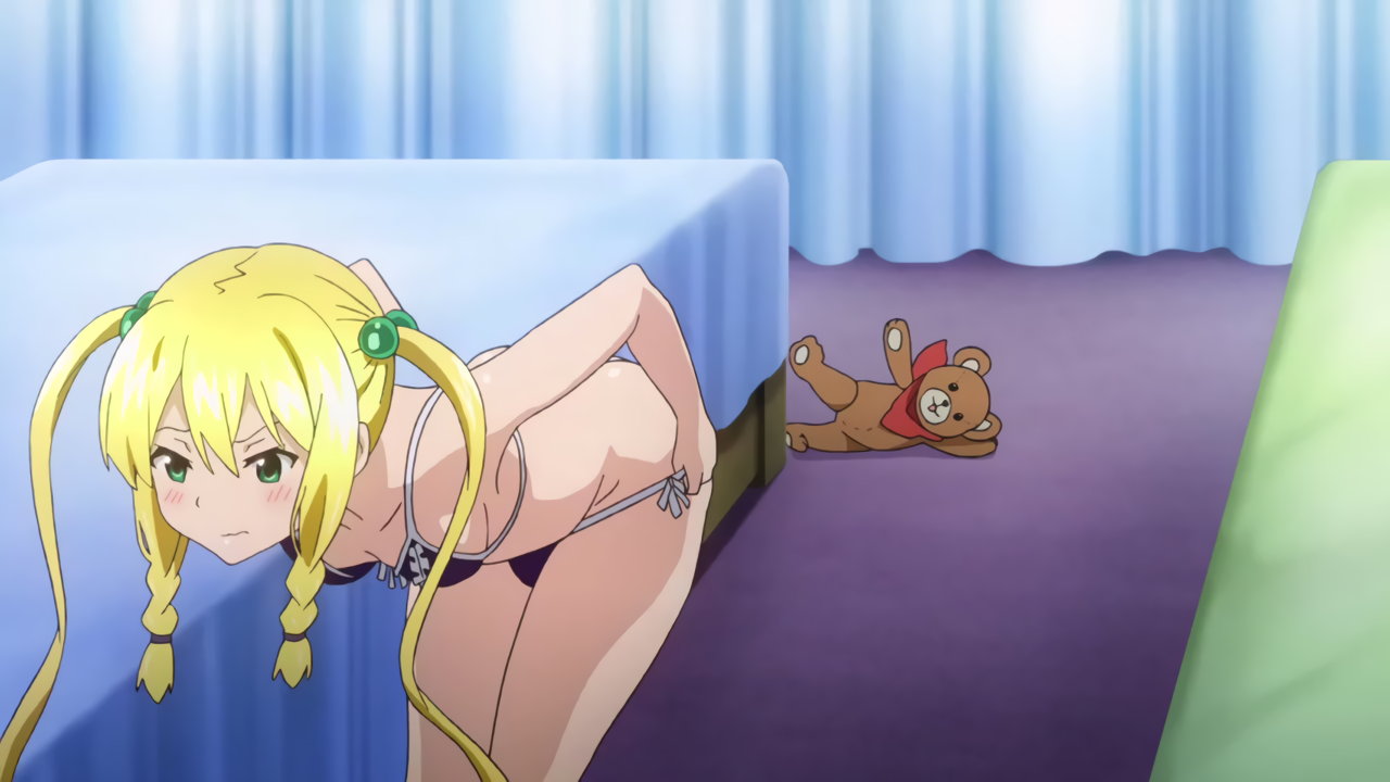 パンツを脱ごうとするコダマ。その尻を見ようとする、テディベアのルドル。