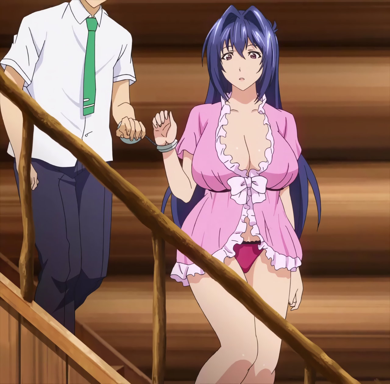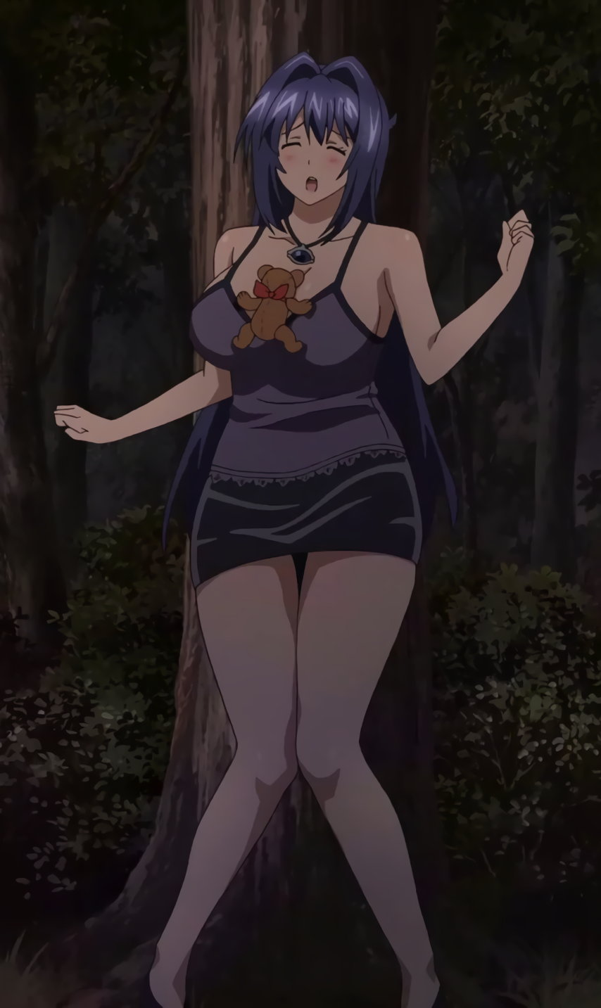 ネグリジェ姿の秋。胸の谷間とパンツ丸出しの、大胆な寝間着である。