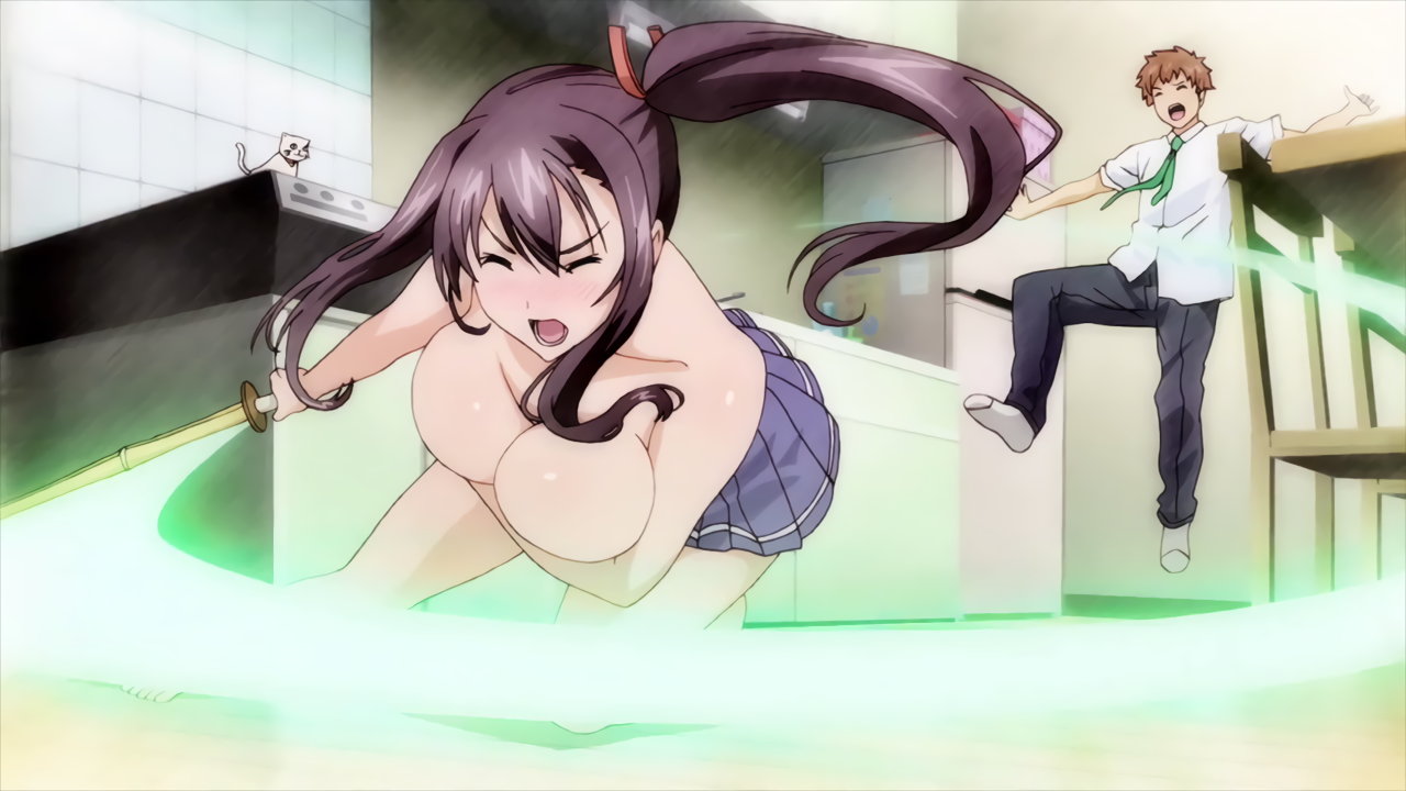 上半身裸で竹刀を振り回す春恋。