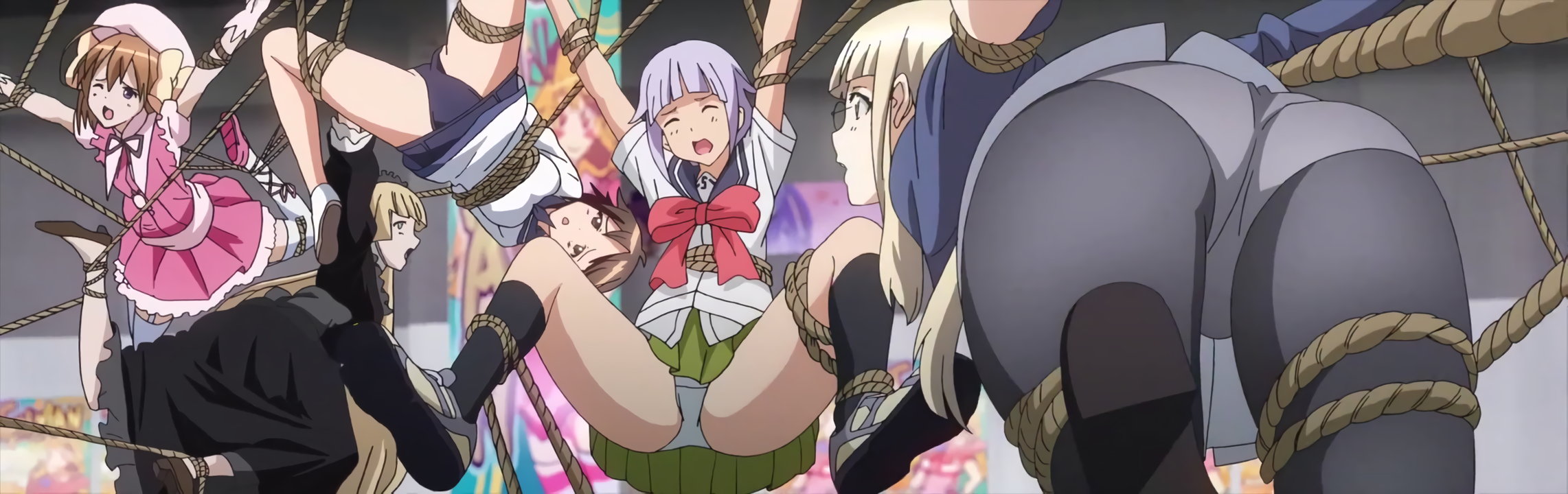 縄で緊縛された、ハルナ(これゾン)、ヴィクトリカ(GOSICK)、芳佳(スト魔女)、FNC(うぽって!!)、ペリーヌ(スト魔女)にコスプレした少女たち。