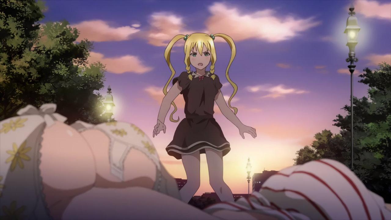 タケルと健悟を蹴り倒し、パンチラするコダマおよびアズキ。