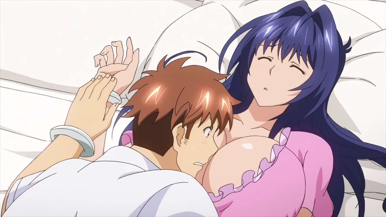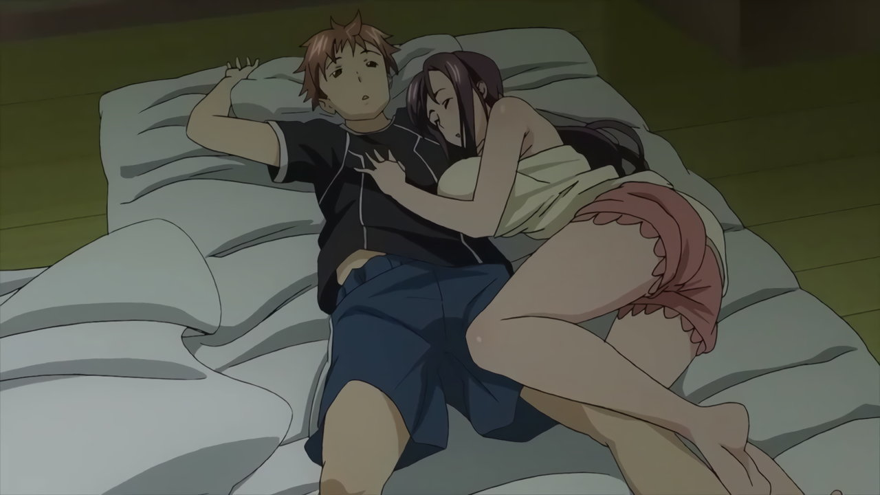 秋の巨乳に顔を埋めるタケルと、悶える秋。
