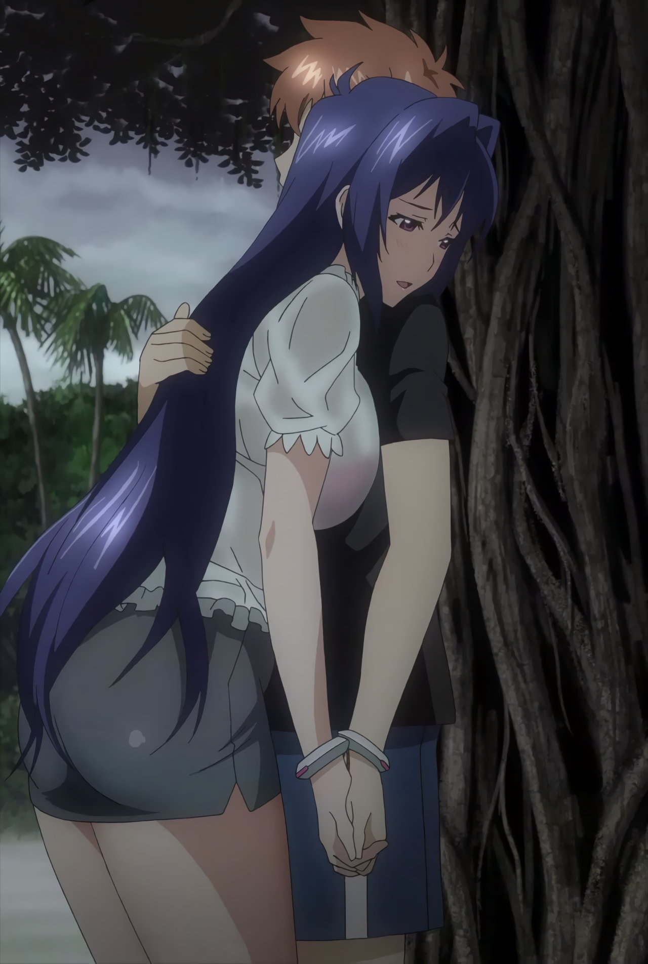 木陰で雨宿り中、タケルに抱かれる秋。雨に濡れて透けブラしている。