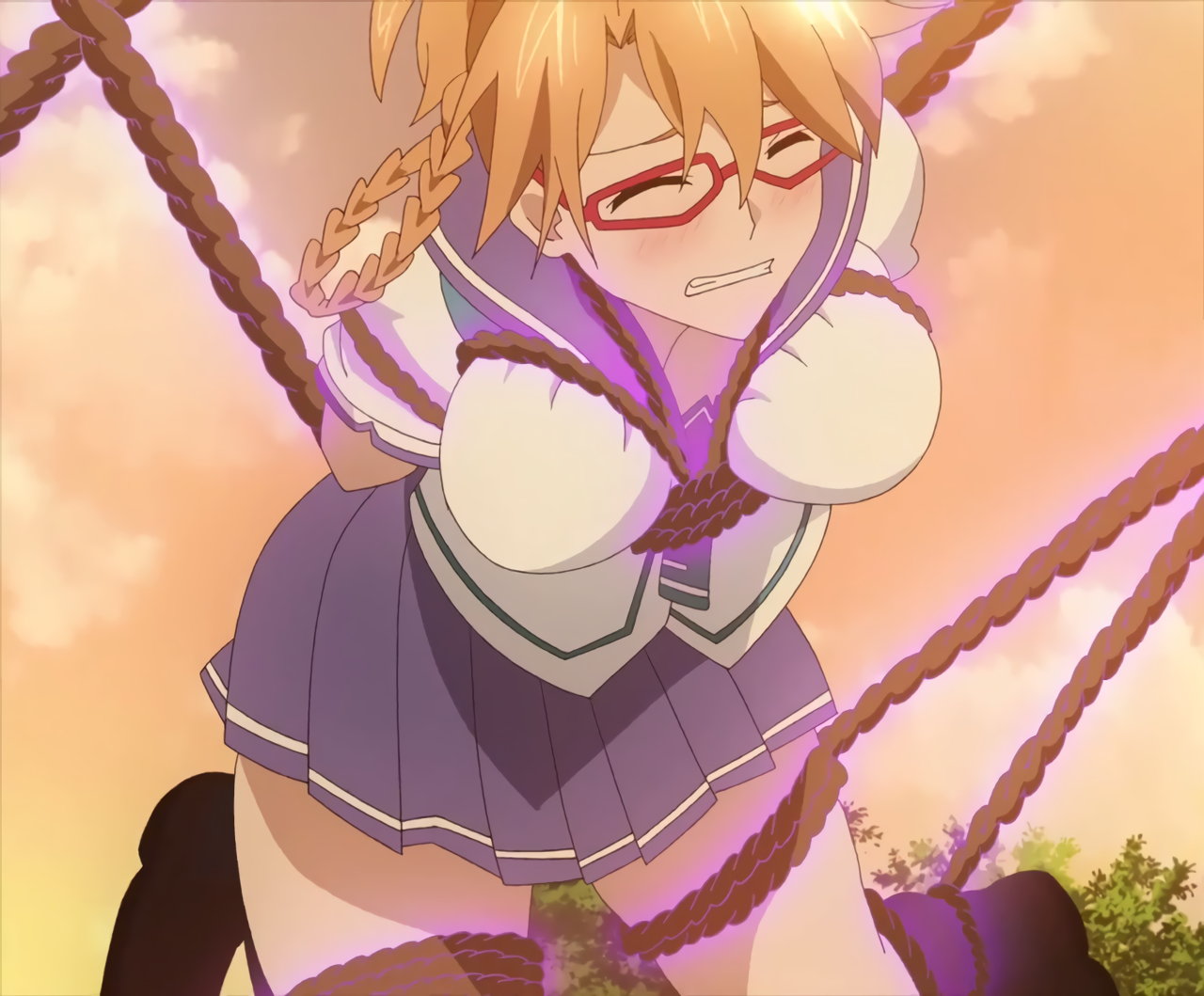 学園に侵入した盗人に体を操られて、人質にされた佐久乃花。ブラジャー・パンツ丸出しになり、自分の首を絞める。