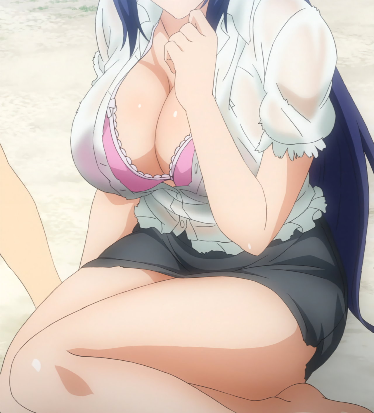 ビキニの紐が解けたため、慌てて腕ブラする春恋。