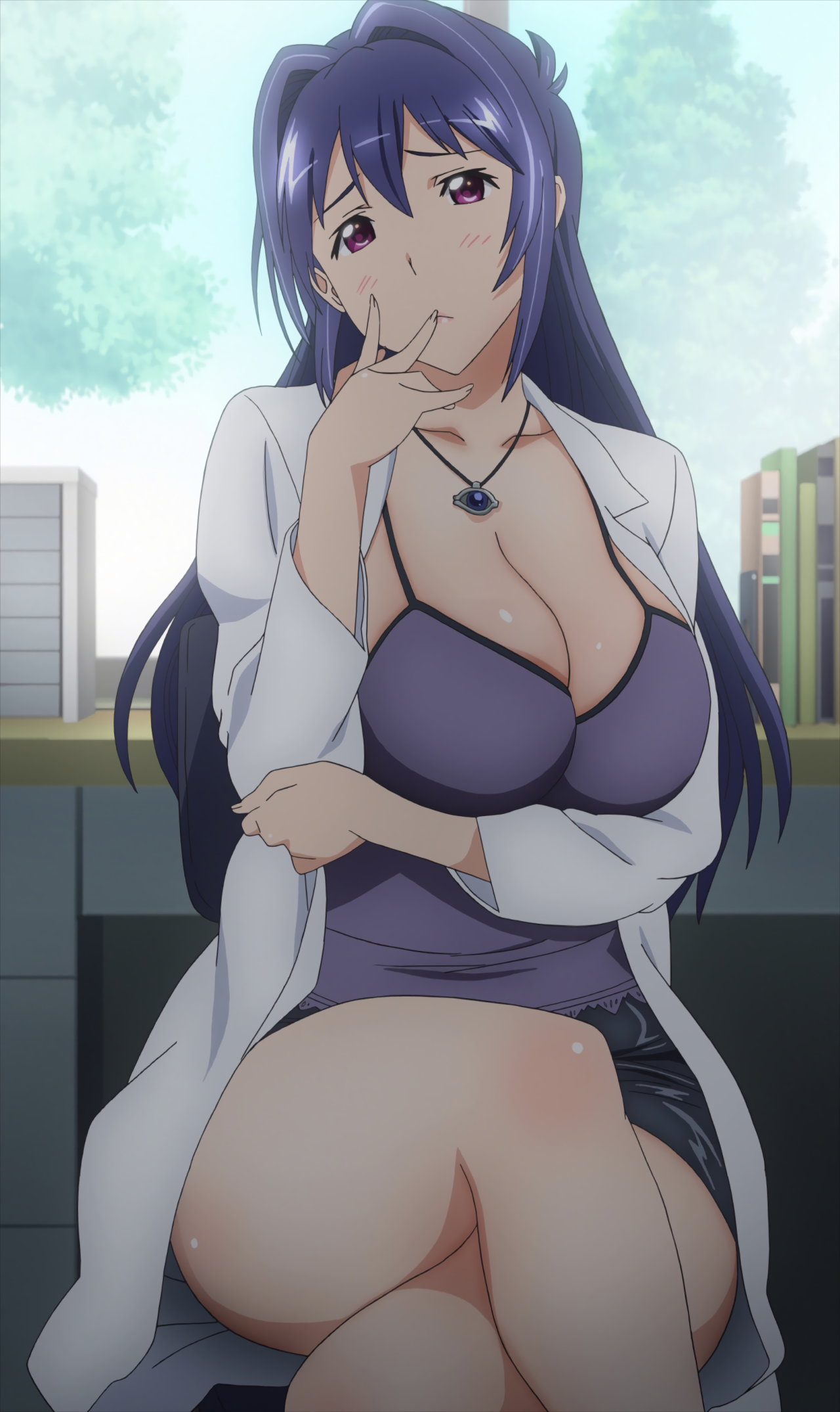 脚を組んで太腿を見せる秋。