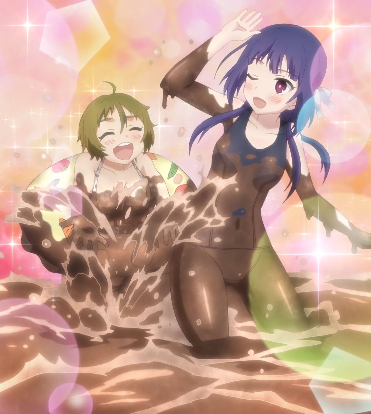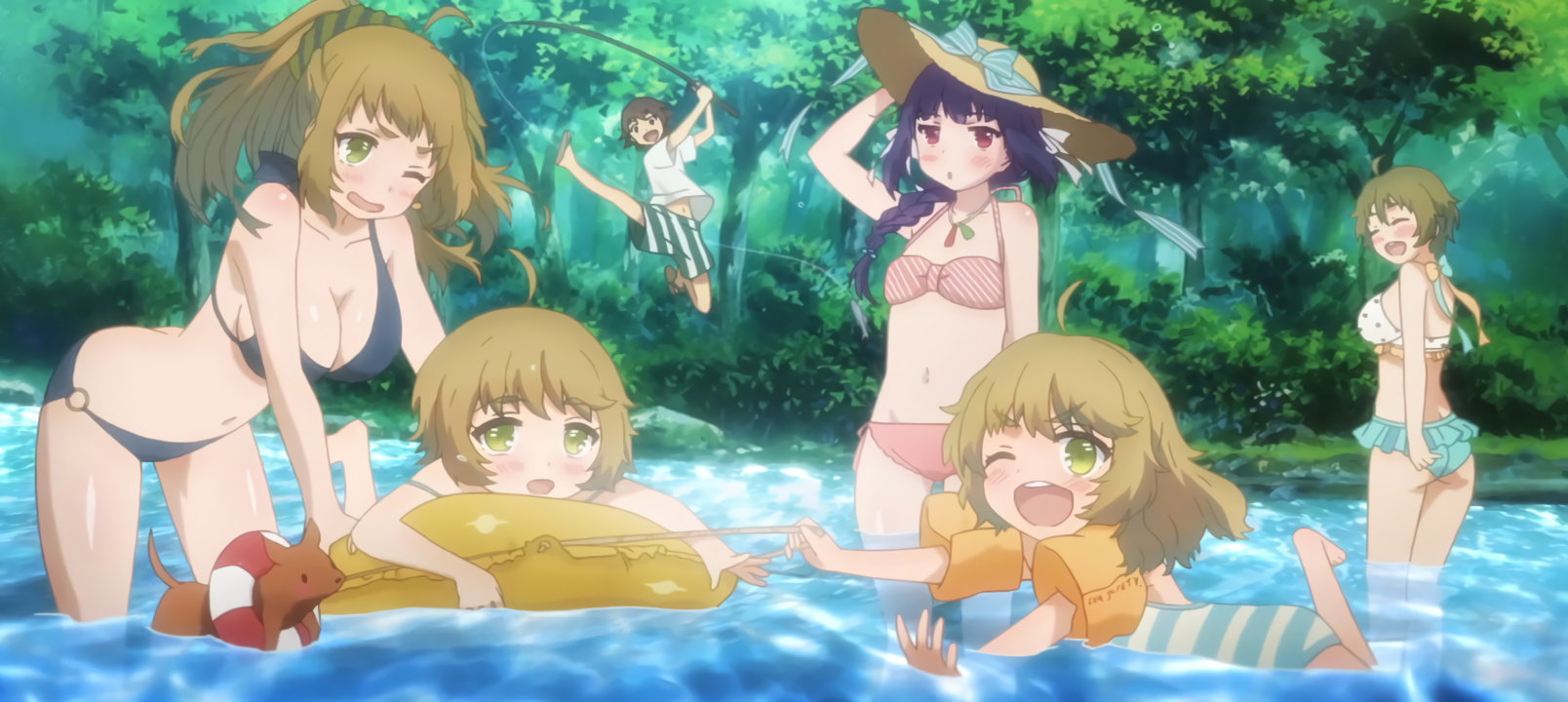 川遊びをする、水着姿の林檎および士農工商姉妹。