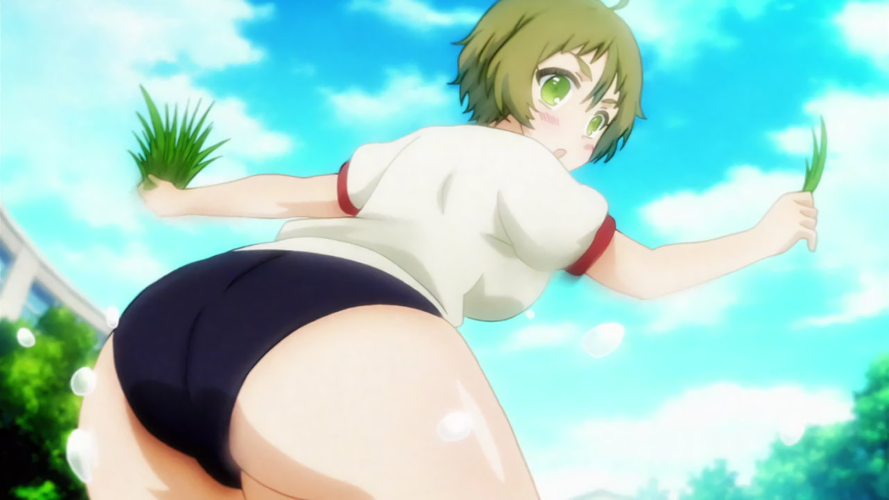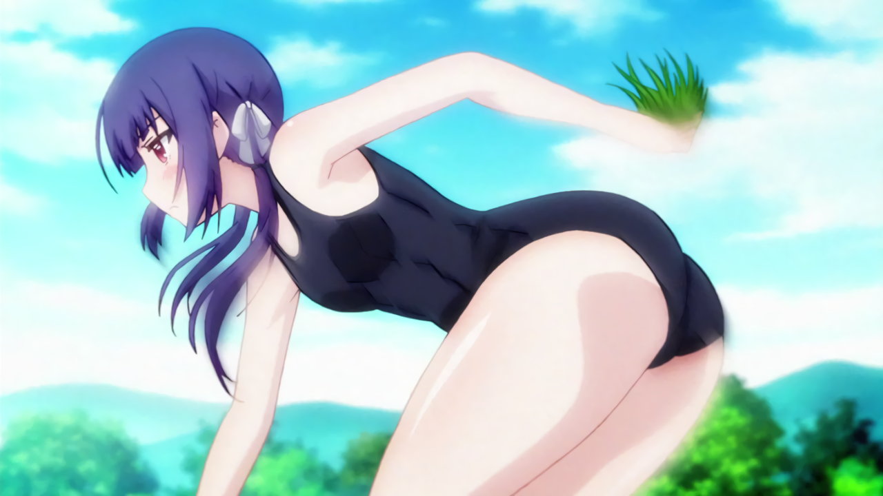 田植え競争をする二人。林檎は旧スク、農はブルマ体操服を着用。