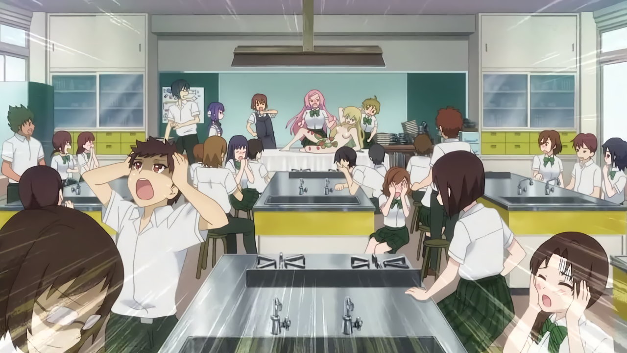 菜摘の女体盛りにドン引きする生徒たち。
