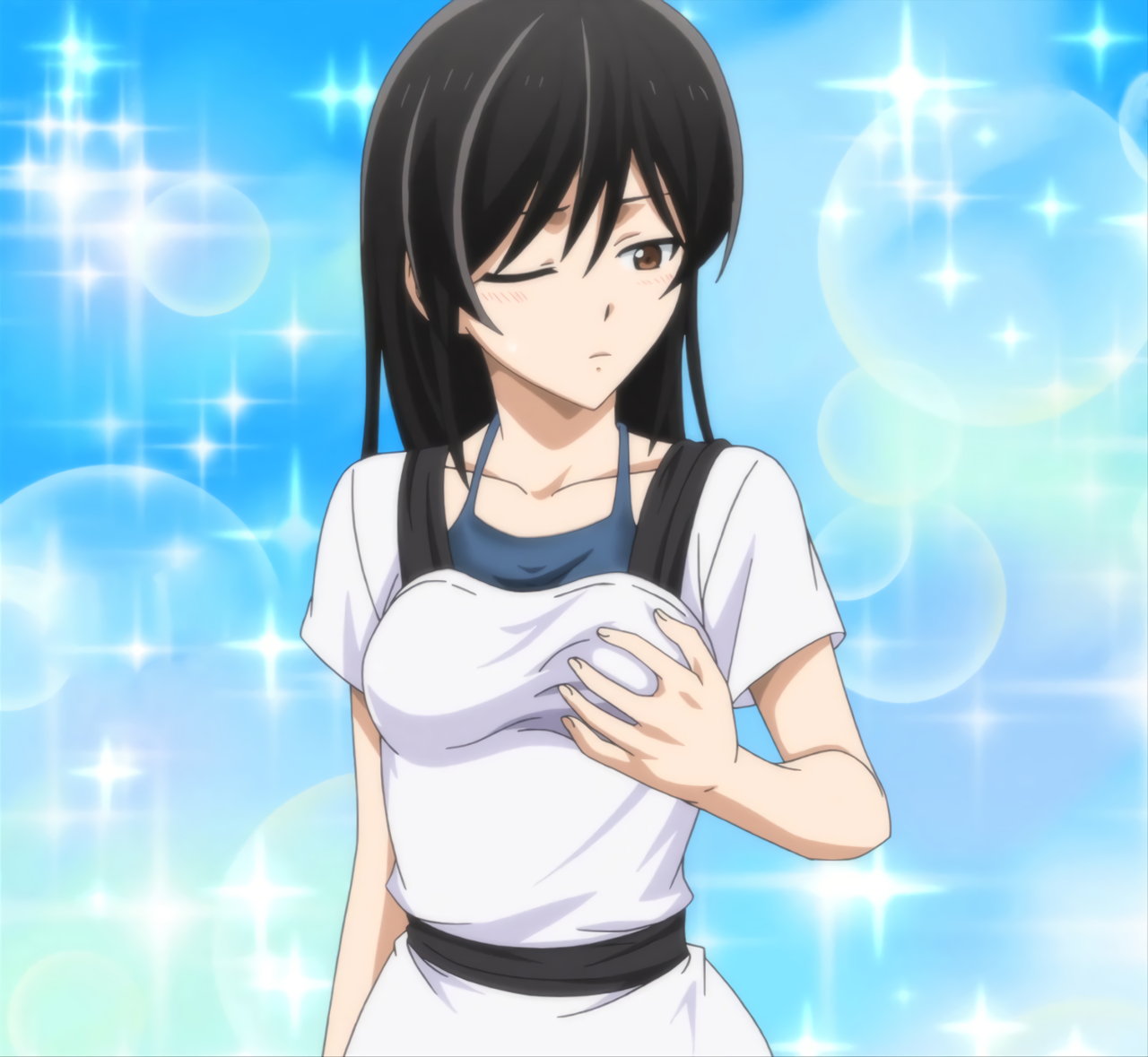 ブラウスが濡れて透けブラする沙穂都。